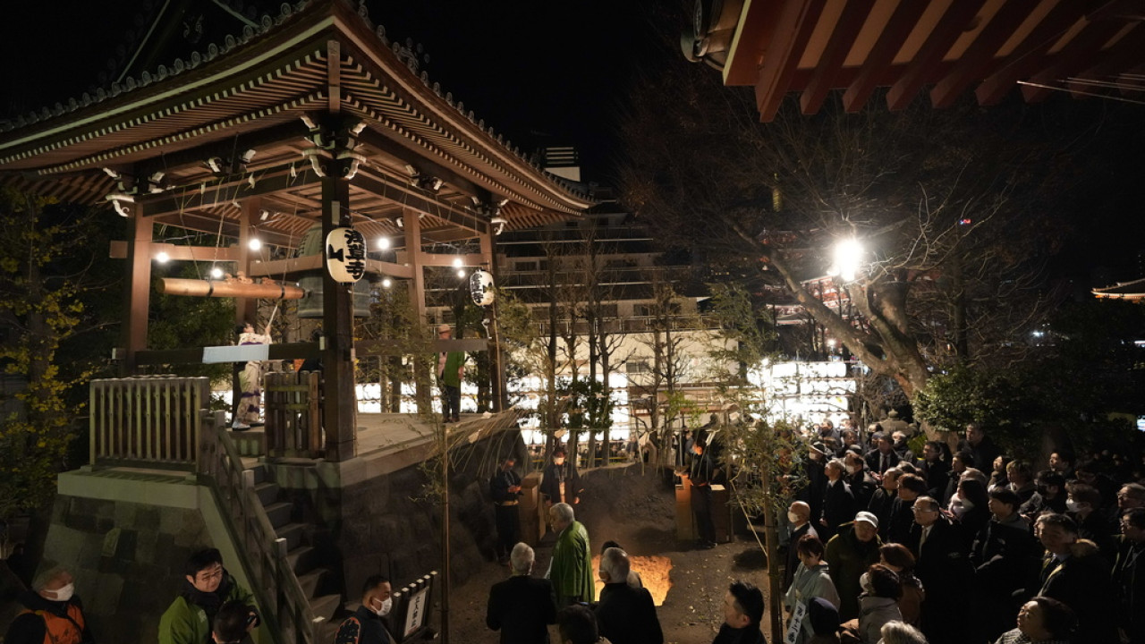 Πλήθη συγκεντρώθηκαν γύρω από τον ναό Tokudai-ji στο Τόκιο, όπου η καμπάνα χτύπησε για να γιορτάσουν την έναρξη του 2025.
