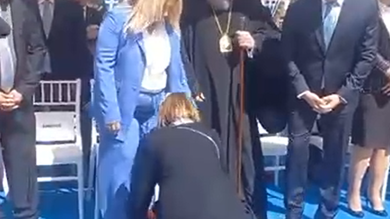 Η οικογένεια των νεαρών κοριτσιών που έχασαν τη ζωή τους στο δυστύχημα των Τεμπών πλησίασε στην εξέδρα των επισήμων στα Τρίκαλα και άφησε τα λουλούδια.