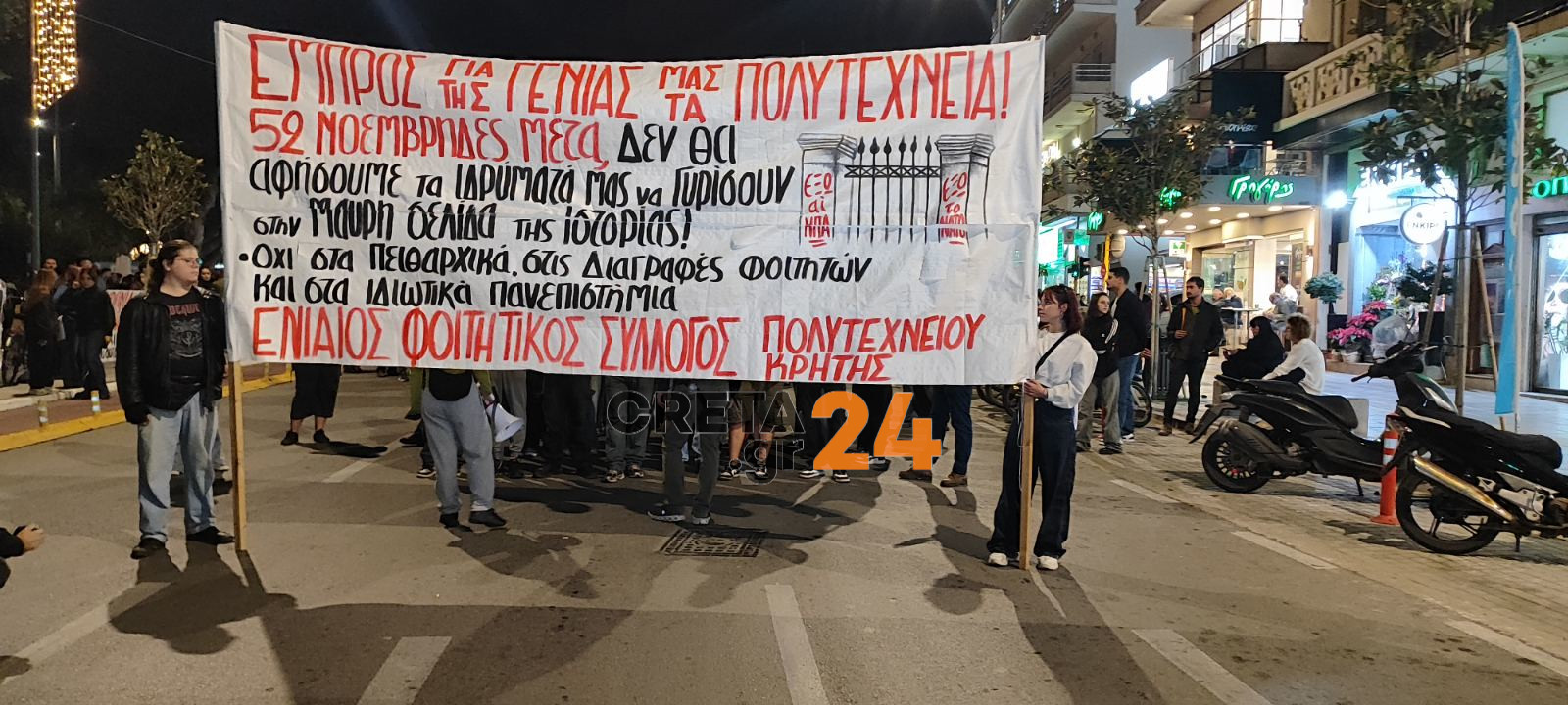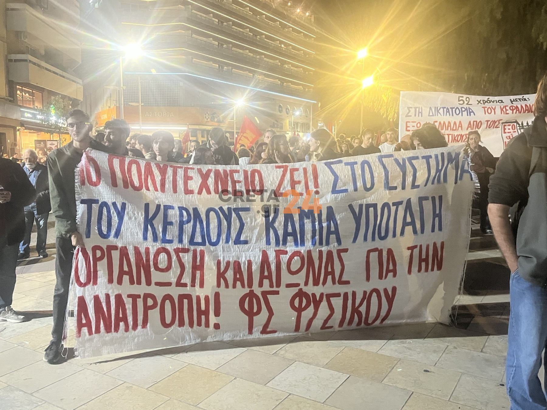 Πολίτες, εκπρόσωποι σωματείων, συλλόγων, φοιτητών, μαθητών κ.α, κρατώντας πανό με συνθήματα, έστειλαν το μήνυμα πως «το Πολυτεχνείο ζει», πραγματοποιώντας πορεία σε κεντρικούς δρόμους του Ηρακλείου. Η πορεία ξεκίνησε νωρίτερα το απόγευμα της 17ης Νοεμβρίου, ενώ ισχυρή είναι η παρουσία της αστυνομίας για την αποτροπή επεισοδίων.
