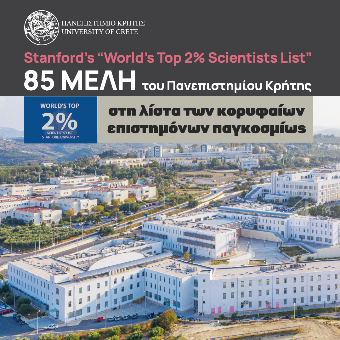 Συνολικά 85 μέλη της ακαδημαϊκής κοινότητας του Πανεπιστημίου Κρήτης (καθηγητές, διδάσκοντες και ερευνητές) περιλαμβάνονται στη λίστα World’s Top 2% Scientists του Πανεπιστημίου Στάνφορντ, η οποία αναδεικνύει τους κορυφαίους επιστήμονες παγκοσμίως. Αναλυτικότερα, 42 μέλη ανήκουν στη Σχολή Θετικών και Τεχνολογικών Επιστημών, 39 στην Ιατρική Σχολή, 2 στη Σχολή Κοινωνικών Επιστημών, 1 στη Σχολή Επιστημών Αγωγής και 1 στη Φιλοσοφική Σχολή.