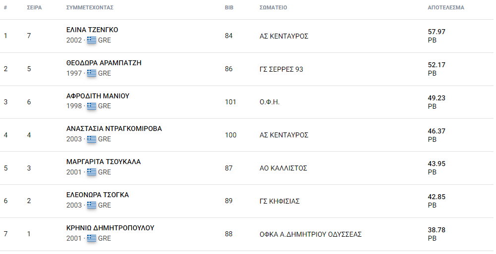 Η Ελίνα Τζένγκο έστειλε το ακόντιό της στα 57,97 μέτρα, παίρνοντας τη νίκη στην τελευταία της βολή, ενώ νωρίτερα πρώτη είχε περάσει η Θεωδόρα Αραμπατζή με 52,17μ. Την τρίτη θέση πήρε η Αφροδίτη Μανιού με επίδοση 49,23μ.
