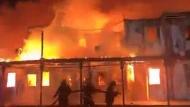Εικόνες από τοπικά μέσα ενημέρωσης που τραβήχτηκαν κατά τη διάρκεια της νύχτας έδειχναν φλόγες να κατακλύζουν ένα κτίριο, ενώ πυκνός καπνός υψωνόταν από άλλο τμήμα του ίδιου συγκροτήματος και εργαζόμενοι απομάκρυναν σορούς σε φορεία.
