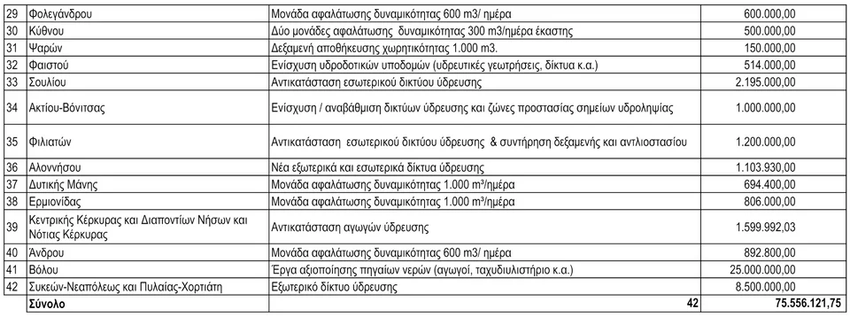 Ο υπουργός Περιβάλλοντος και Ενέργειας Σταύρος Παπασταύρου ενέκρινε συνολικά 42 έργα, με χρηματοδότηση ύψους 75.556.121,75 ευρώ, για τη δημιουργία, την ενίσχυση και τον εκσυγχρονισμό των υποδομών διαχείρισης υδάτων.