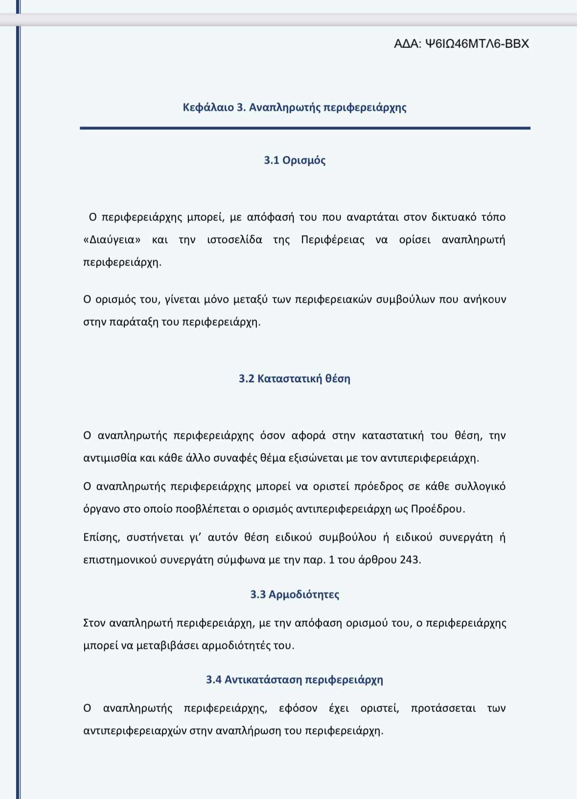 Απόλυτα ξεκάθαρη ως προς τον ορισμό, την καταστατική θέση και το φάσμα των αρμοδιοτήτων του αναπληρωτή Περιφερειάρχη είναι η διάταξη του Υπουργείου Εσωτερικών για τους αναπληρωτές Περιφερειάρχες.