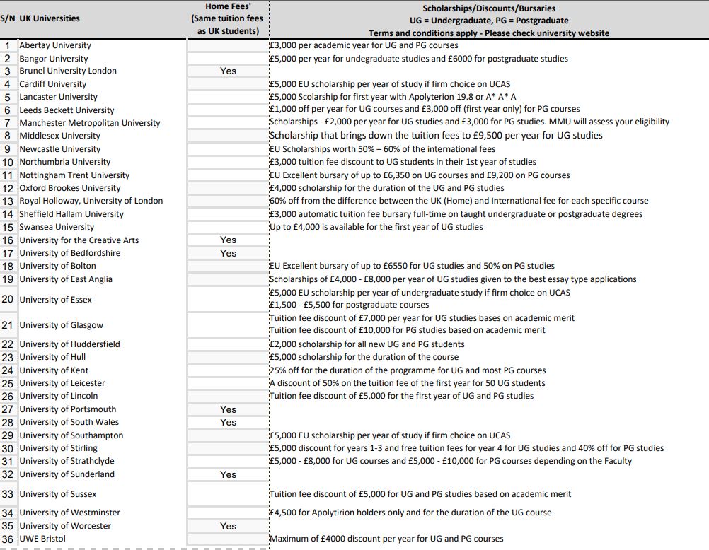“Τα πανεπιστήμια αυτά για το επόμενο ακαδημαϊκό έτος 2022-2023 και για τη διάρκεια του προγράμματος σπουδών για τα πλείστα πανεπιστήμια: Θα διατηρήσουν τα ‘Home Fees’ για όλους του Ευρωπαίους φοιτητές, δηλαδή θα διατηρήσουν το ίδιο ύψος των διδάκτρων με αυτά που απολαμβάνουν σήμερα και οι Βρετανοί φοιτητές και που ίσχυαν πριν από το BREXIT, ή Θα προσφέρουν εκπτώσεις ή/και υποτροφίες σε φοιτητές από την Κύπρο/ΕΕ. Σε κάποια πανεπιστήμια αυτές οι εκπτώσεις/υποτροφίες δίνονται ‘αυτόματα’ σε όλους τους Ευρωπαίους πολίτες ενώ σε άλλα ισχύουν όροι και προϋποθέσεις”.