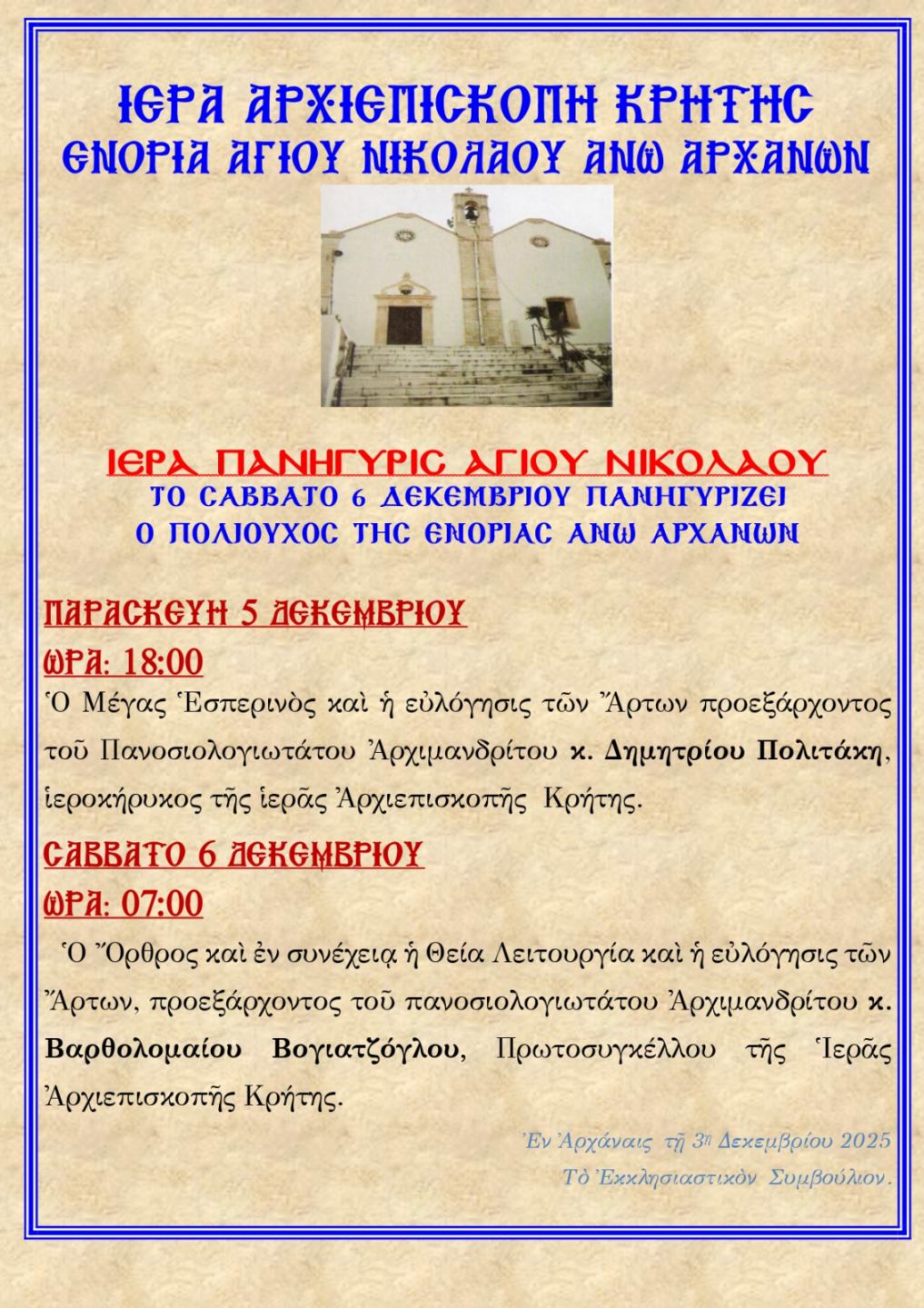 Παραμονή και ανήμερα της εορτής του Αγίου Νικολάου, πανηγυρίζει ο πολιούχος της Ενορίας των Άνω Αρχανών.