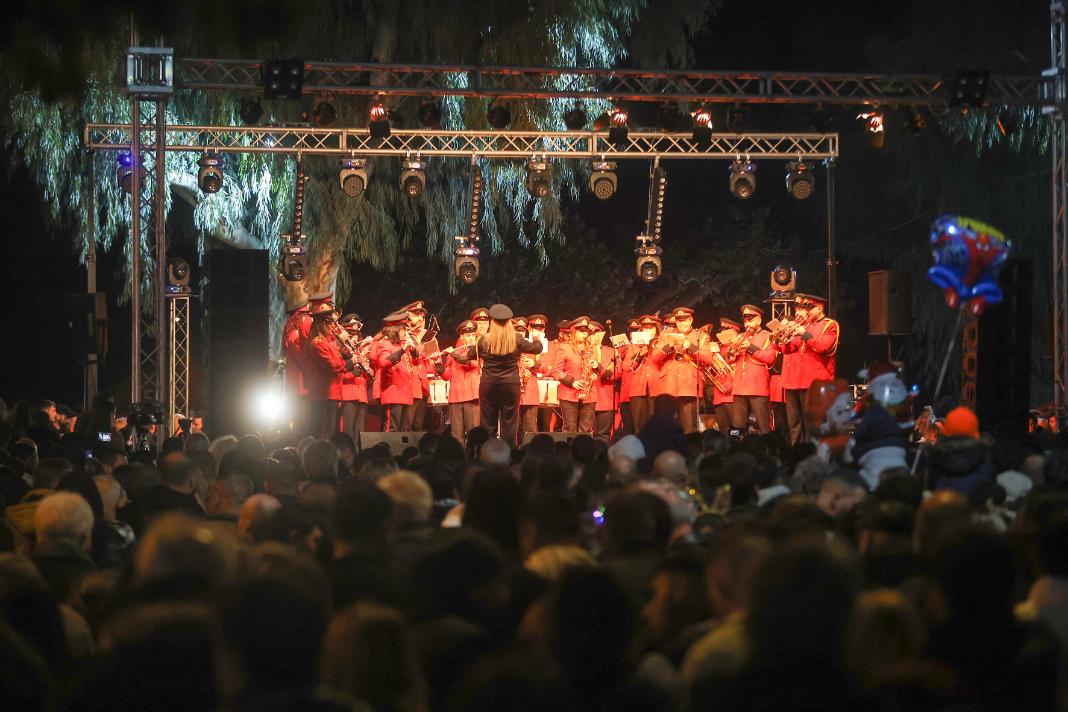 Στη συνέχεια ο Αλέξης Καλοκαιρινός έδωσε το σύνθημα, όλος ο κόσμος της πλατείας έκανε την αντίστροφη μέτρηση υποδεχόμενος με χειροκροτήματα, τους ήχους της Φιλαρμονικής και τα «αθόρυβα» πυροτεχνήματα, τη νέα χρονιά.
