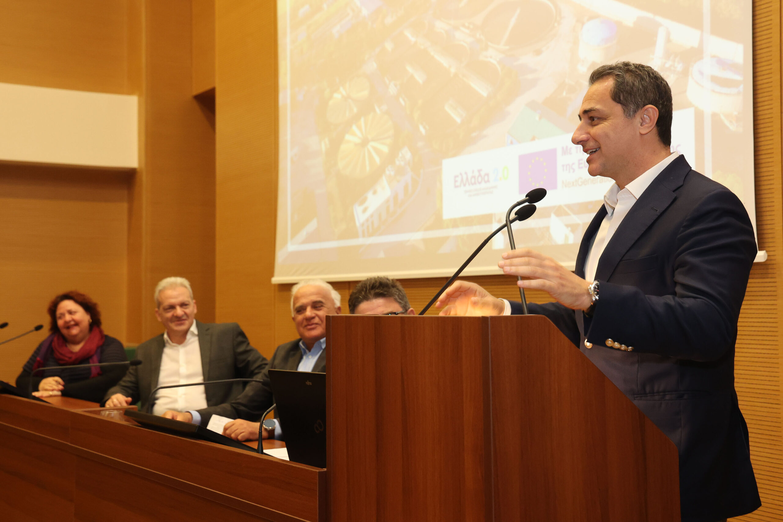 Χαιρετισμό στην εκδήλωση απηύθυναν ο Υφυπουργός Ανάπτυξης Μάξιμος Σενετάκης, ο Περιφερειάρχης Κρήτης Σταύρος Αρναουτάκης και μέσω σύνδεσης ο Γενικός Γραμματέας Διαχείρισης Αποβλήτων Μανώλης Γραφάκος. Η παρουσίαση του έργου έγινε από τον Γενικό Διευθυντή της ΔΕΥΑΗ Μανώλη Κοσμαδάκη, τον μελετητή του έργου, Πρόεδρο & Δ/νων Σύμβουλο της ΕΜΒΗΣ ΑΕ Απόστολο Τζίμα και τον Αντιπρόεδρο της αναδόχου εταιρείας Thalis ES και Γενικό Δ/ντη Waste Management Motor Oil Δημήτρη Κονταξή.