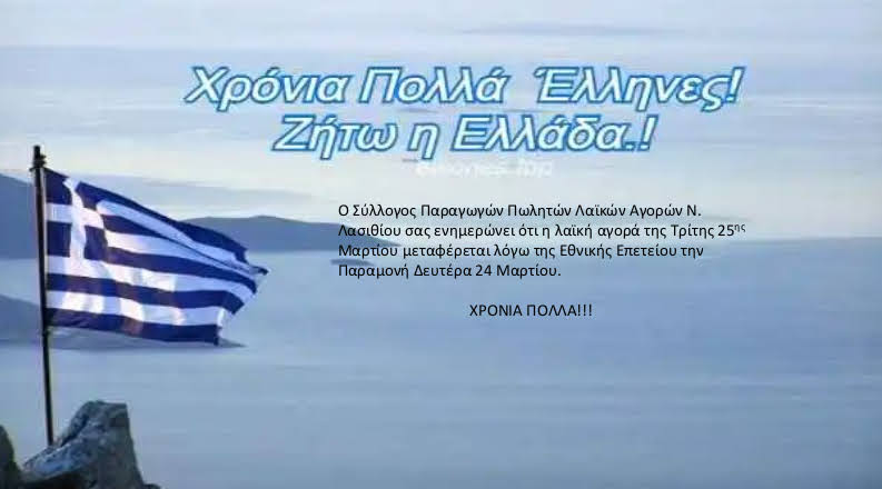 Ο Σύλλογος Παραγωγών Πωλητών Λαϊκών Αγορών Ν. Λασιθίου ενημερώνει το καταναλωτικό κοινό πως, λόγω της Εθνικής Επετείου της 25ης Μαρτίου, η προγραμματισμένη λαϊκή αγορά της Τρίτης θα πραγματοποιηθεί μία ημέρα νωρίτερα, τη Δευτέρα 24 Μαρτίου.
