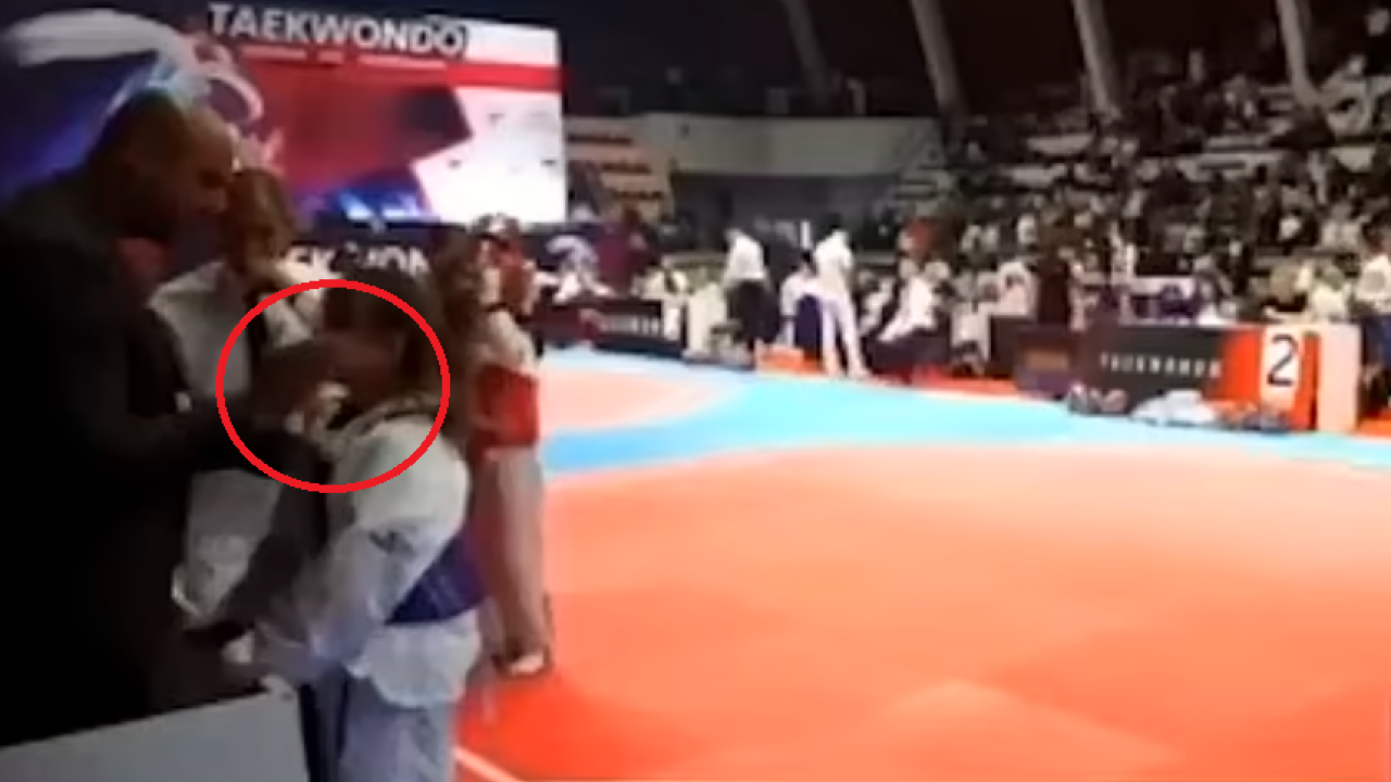 Ένας διαιτητής του Ταεκβοντό, ο οποίος είδε το χαστούκι, επεμβαίνει και λέει στον άνδρα να σταματήσει.
