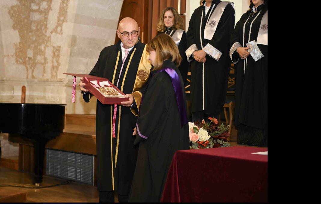 Ακολούθησε η περιένδυση της τιμώμενης με την τήβεννο και το επιτηβέννιο της Σχολής και η επίδοση των τίτλων και του χρυσού μεταλλίου του Πανεπιστημίου Κρήτης από τον Πρύτανη Καθηγητή Γεώργιο Μ. Κοντάκη.