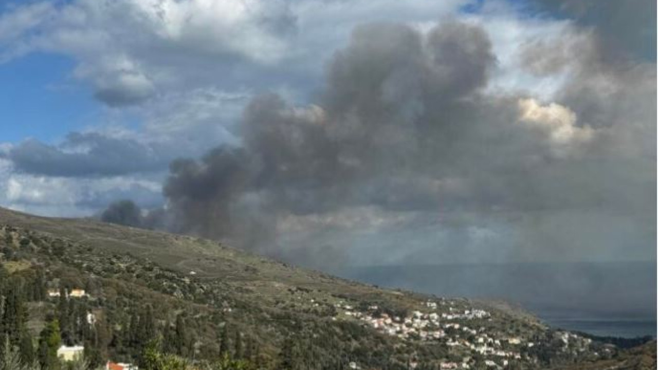 Η φωτιά καίει σε σημείο με χαμηλή βλάστηση ωστόσο στην περιοχή πνέουν βοριάδες εντάσεως έως 8 μποφόρ
