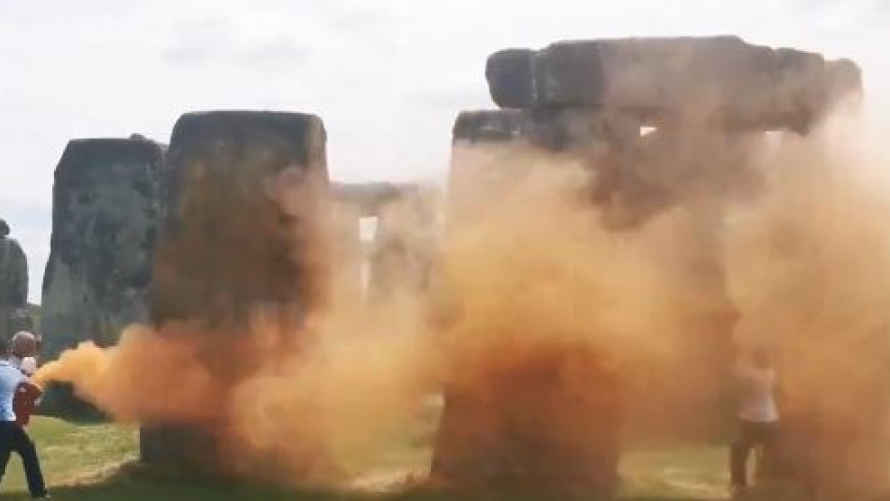 Μια ημέρα πριν ξεκινήσουν οι εορτασμοί για το Θερινό Ηλιοστάσιο στο ορόσημο των 5.000 ετών, δύο ακτιβιστές, ψέκασαν με πορτοκαλί«πούδρα», το εμβληματικό αρχαίο μνημείο Stonehenge στην Αγγλία, ζητώντας από την κυβέρνηση να σταματήσει την εξόρυξη και την καύση πετρελαίου, φυσικού αερίου και άνθρακα έως το 2030.