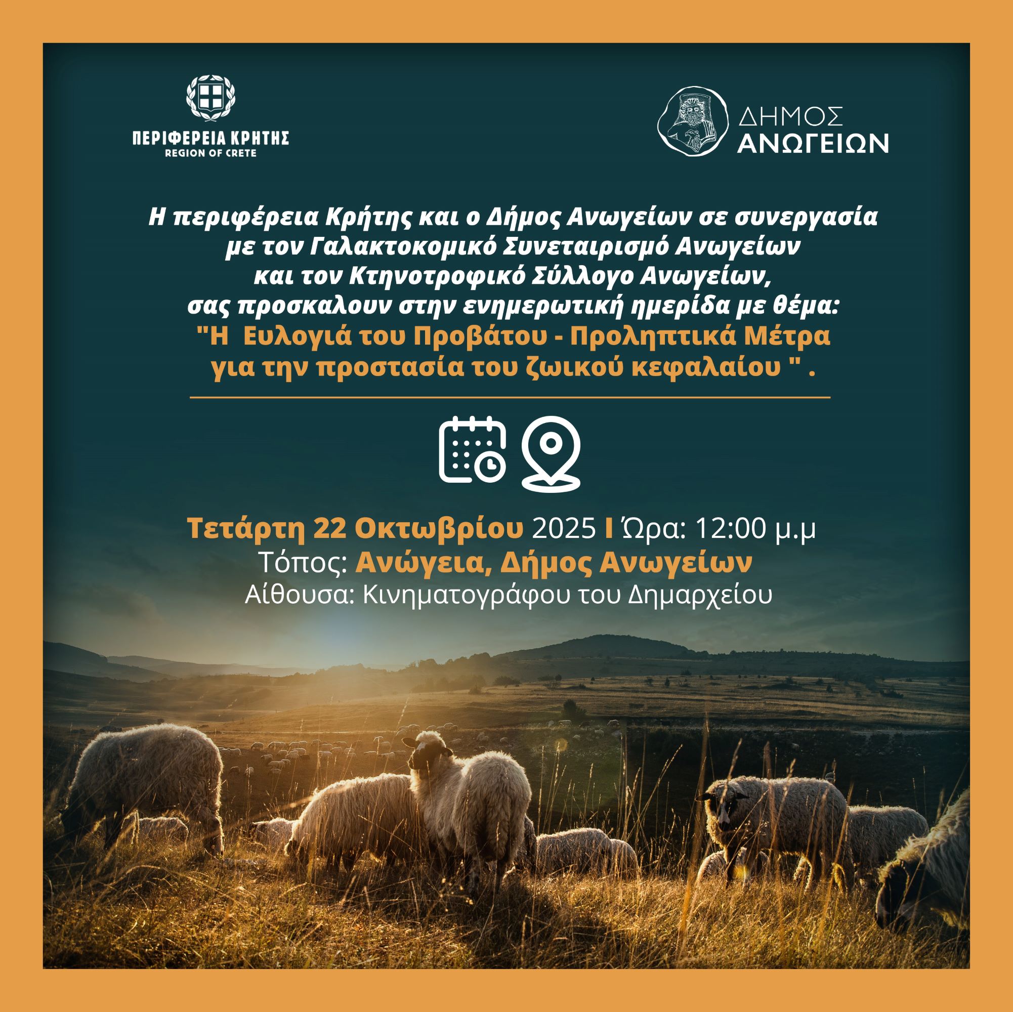 Η Περιφέρεια Κρήτης, με αίσθημα ευθύνης για την προστασία του ζωικού κεφαλαίου του νησιού, διοργανώνει ενημερωτική ημερίδα με θέμα: «Η Ευλογιά του Προβάτου – Προληπτικά Μέτρα για την Προστασία του Ζωικού Κεφαλαίου».