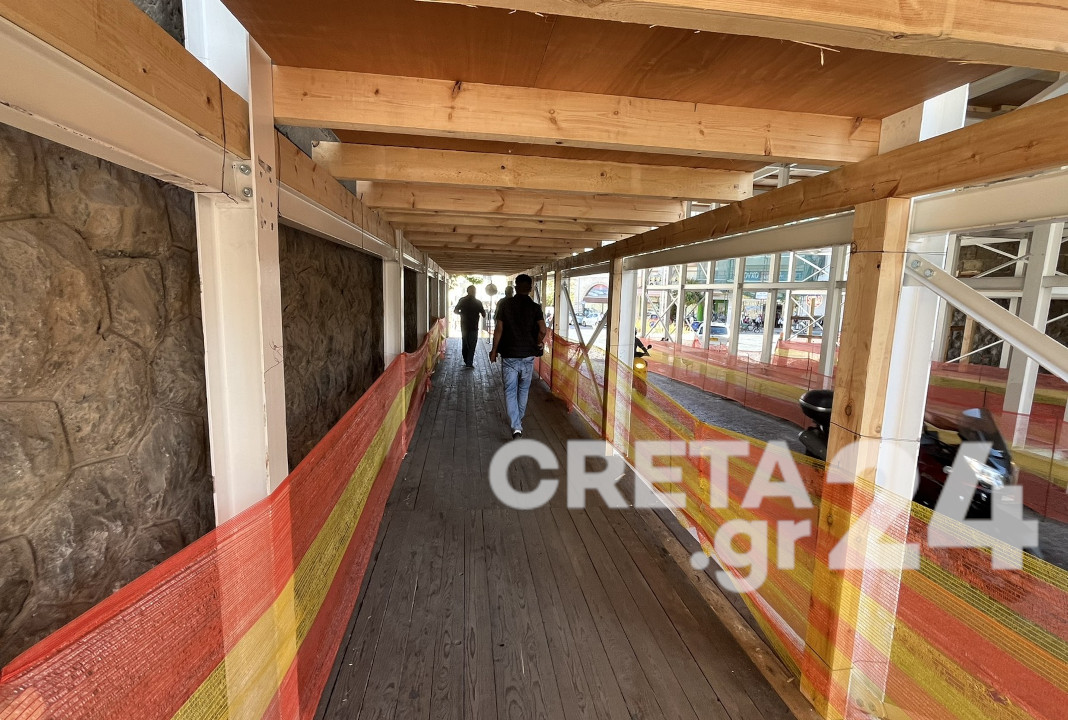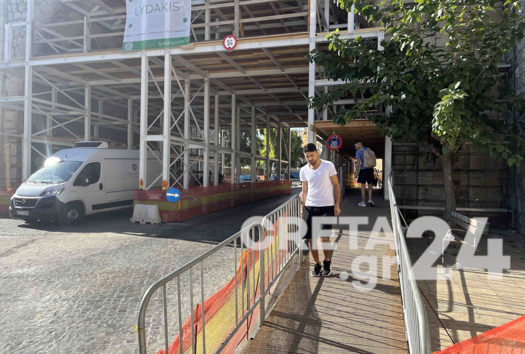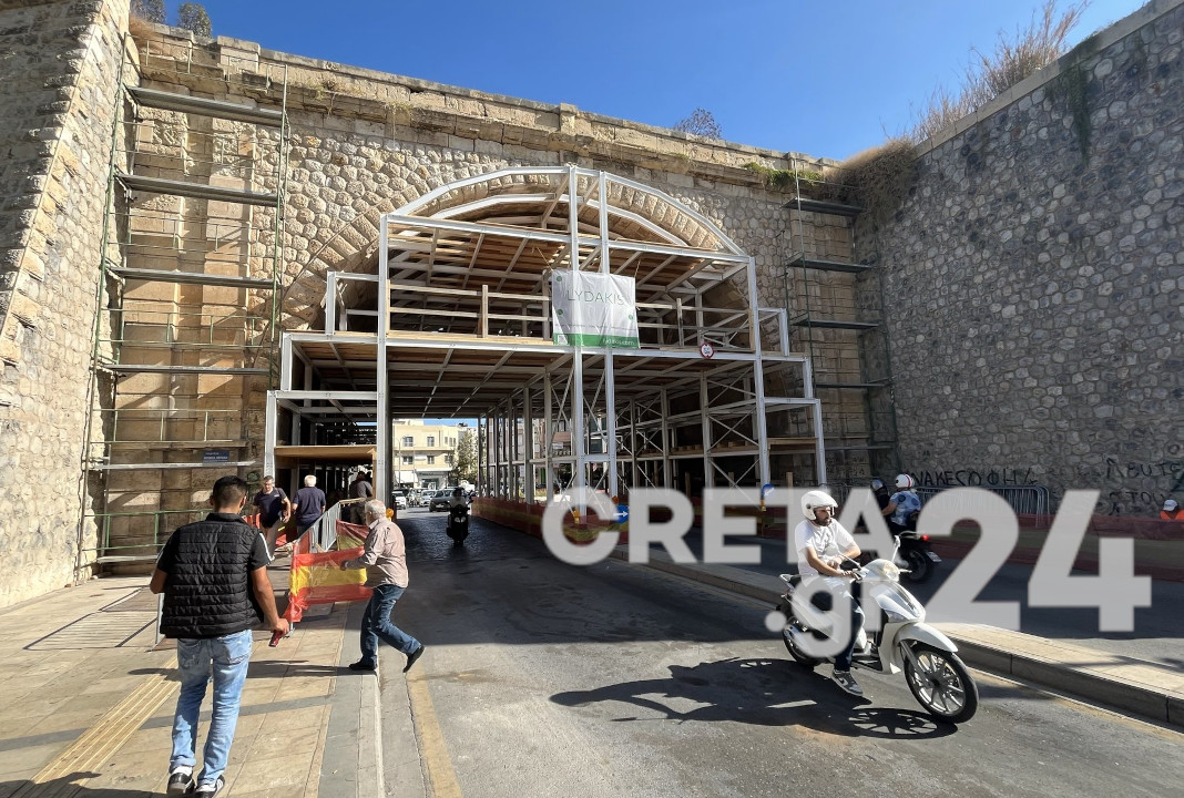 Άνοιξε και πάλι, το πρωί της Δευτέρας, για τα οχήματα η Χανιώπορτα, μετά τις εργασίες για την τοποθέτηση της σκαλωσιάς, πάνω στην οποία θα συνεχιστεί το έργο της στερέωσης του τείχους.