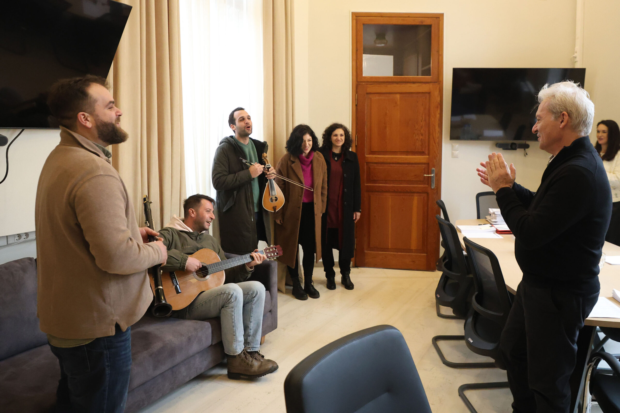 Με τη συνοδεία κλαρίνου, λύρας και κιθάρας, ο Καλλιτεχνικός Διευθυντής του Μουσείου Παραδοσιακών Οργάνων, Έρευνας & Τεκμηρίωσης «Θύραθεν» Γρηγόρης Πιτσικάκης, μαζί με τους μουσικούς Μιχάλη Μπελιβάνη, Γιώργο Κούτσικα, Μαριλένα Βασιλάκη και Ειρήνη Θεοφάνους έψαλαν τα κάλαντα της Κρήτης στον Αλέξη Καλοκαιρινό και αντάλλαξαν χριστουγεννιάτικες ευχές. Ο Δήμαρχος Ηρακλείου ευχήθηκε να καρποφορήσει η προσπάθεια του Μουσείου για την γνωριμία και εξοικείωση του κοινού με την ελληνική παραδοσιακή μουσική.