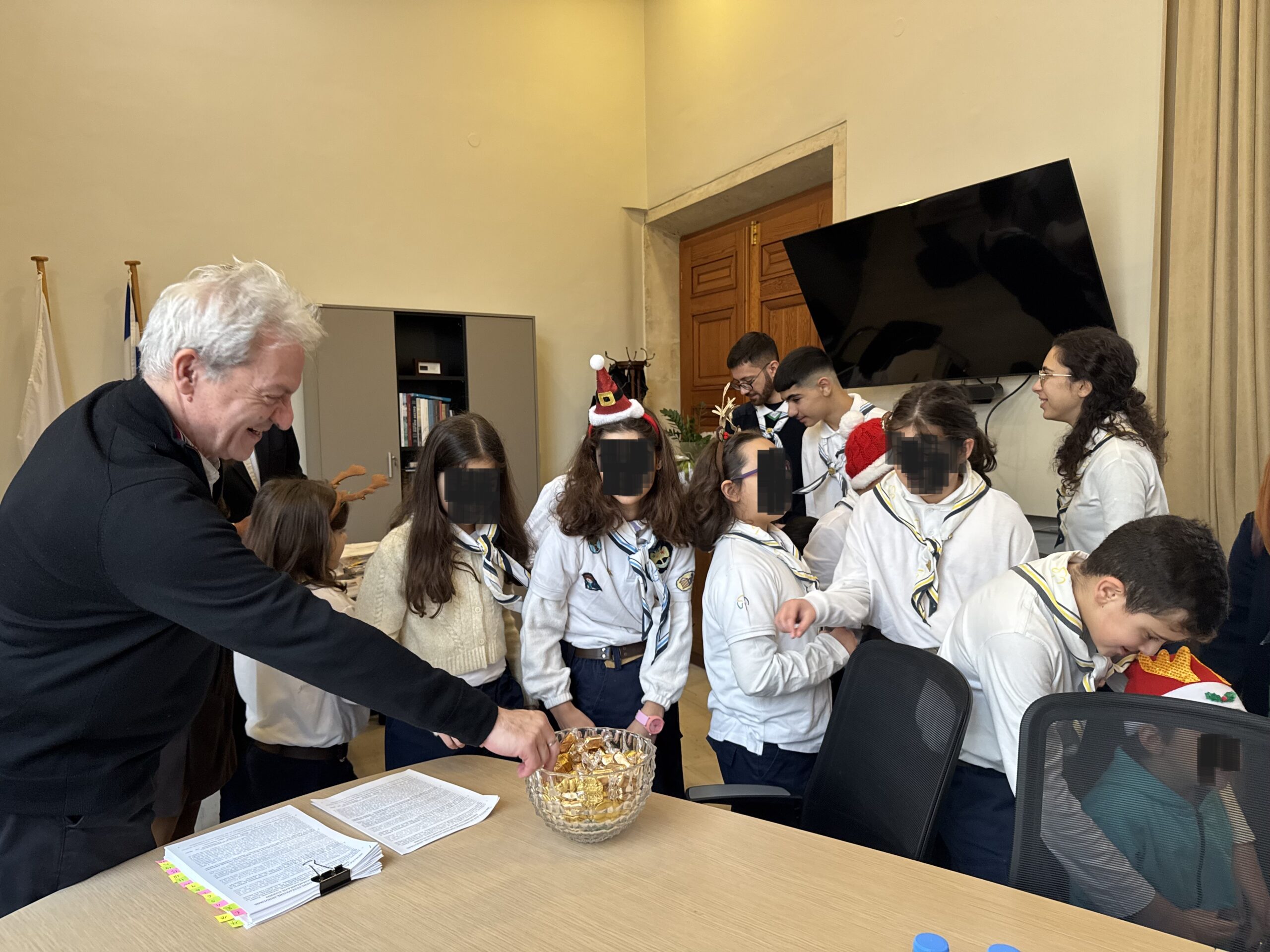 Οι ομάδες των αστεριών και των πουλιών, οι οδηγοί και οι μεγάλοι οδηγοί από το Τοπικό Τμήμα Ηρακλείου του Σώματος Ελληνικού Οδηγισμού μαζί με την Πρόεδρο του Τμήματος Μαλαματένια Παπαδάκη την Έφορο Ελένη Χατζηιωάννου και τα στελέχη Μιχάλη Ζαμάγια και Χριστίνα Μαυραντωνάκη έψαλαν τα κάλαντα και αντάλλαξαν ευχές για υγεία και ευημερία με τον Δήμαρχο Ηρακλείου, τον Αντιδήμαρχο Καθαριότητας, Περιβάλλοντος και Ενέργειας Νίκο Γιαλιτάκη και την Αντιδήμαρχο Πολιτισμού Ρένα Παπαδάκη-Σκαλίδη.