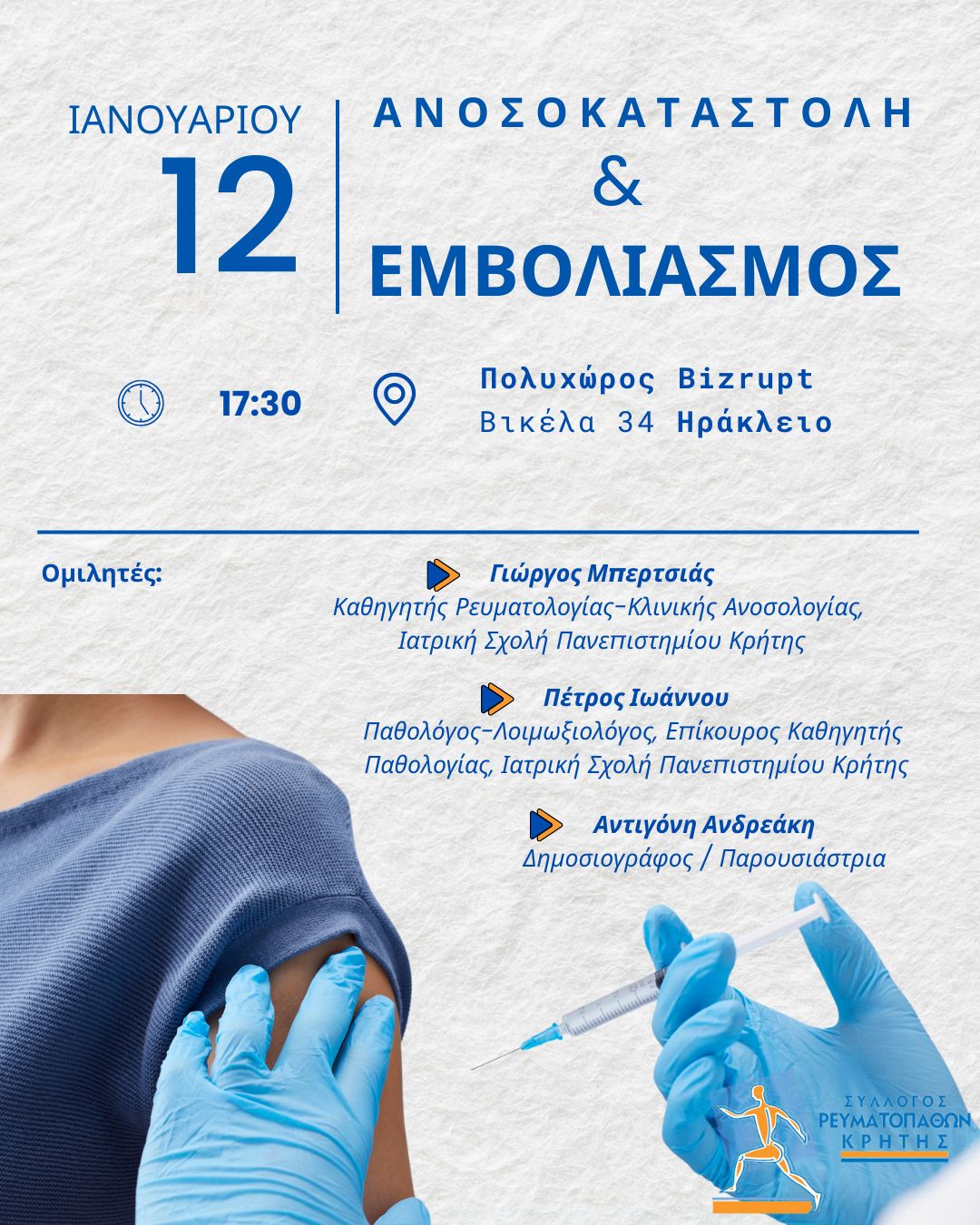 Ο Σύλλογος Ρευματοπαθών Κρήτης, στο πλαίσιο του προγραμματισμού ενημέρωσης κοινού για το 2026, διοργανώνει εσπερίδα τη Δευτέρα 12/01/2026 και ώρα 17:30 στον Πολυχώρο Bizrupt, Βικέλα 34 στο Ηράκλειο. Ο τίτλος της εκδήλωσης είναι «Ανοκαταστολή & Eμβολιασμός». Oμιλητές της εκδήλωσης θα είναι: