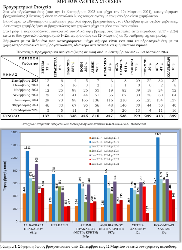 Κοινοποιώντας στον Υπουργό Αγροτικής Ανάπτυξης και Τροφίμων και τον Υπουργό Υποδομών και Μεταφορών το Τεχνικό Δελτίο για «Γεωργικές Προειδοποιήσεις», το οποίο εκδόθηκε από το Περιφερειακό Κέντρο Προστασίας Φυτών Ποιοτικού & Φυτοϋγειονομικού Ελέγχου Ηρακλείου, με τα βροχομετρικά στοιχεία της περιόδου Σεπτέμβριος 2023 έως Μάρτιο 2024, τα οποία είναι ιδιαίτερα ανησυχητικά, καθώς η ανομβρία που πλήττει την Περιφερειακή Ενότητα Ηρακλείου είναι η μεγαλύτερη των τελευταίων χρόνων, ο Φραγκίσκος Παρασύρης, Βουλευτής Ηρακλείου του ΠΑΣΟΚ-Κινήματος Αλλαγής, ζητά τη λήψη μέτρων για την αντιμετώπιση της κατάστασης, η οποία έχει αρχίσει ήδη να επηρεάζει τους αγρότες της Κρήτης και ιδιαίτερα της Μεσαράς. Για το γεγονός αυτό και επιβεβαιώνοντας την ανησυχία των τοπικών φορέων, πραγματοποιήθηκε σύσκεψη χθες στην Αποκεντρωμένη Διοίκηση Κρήτης.