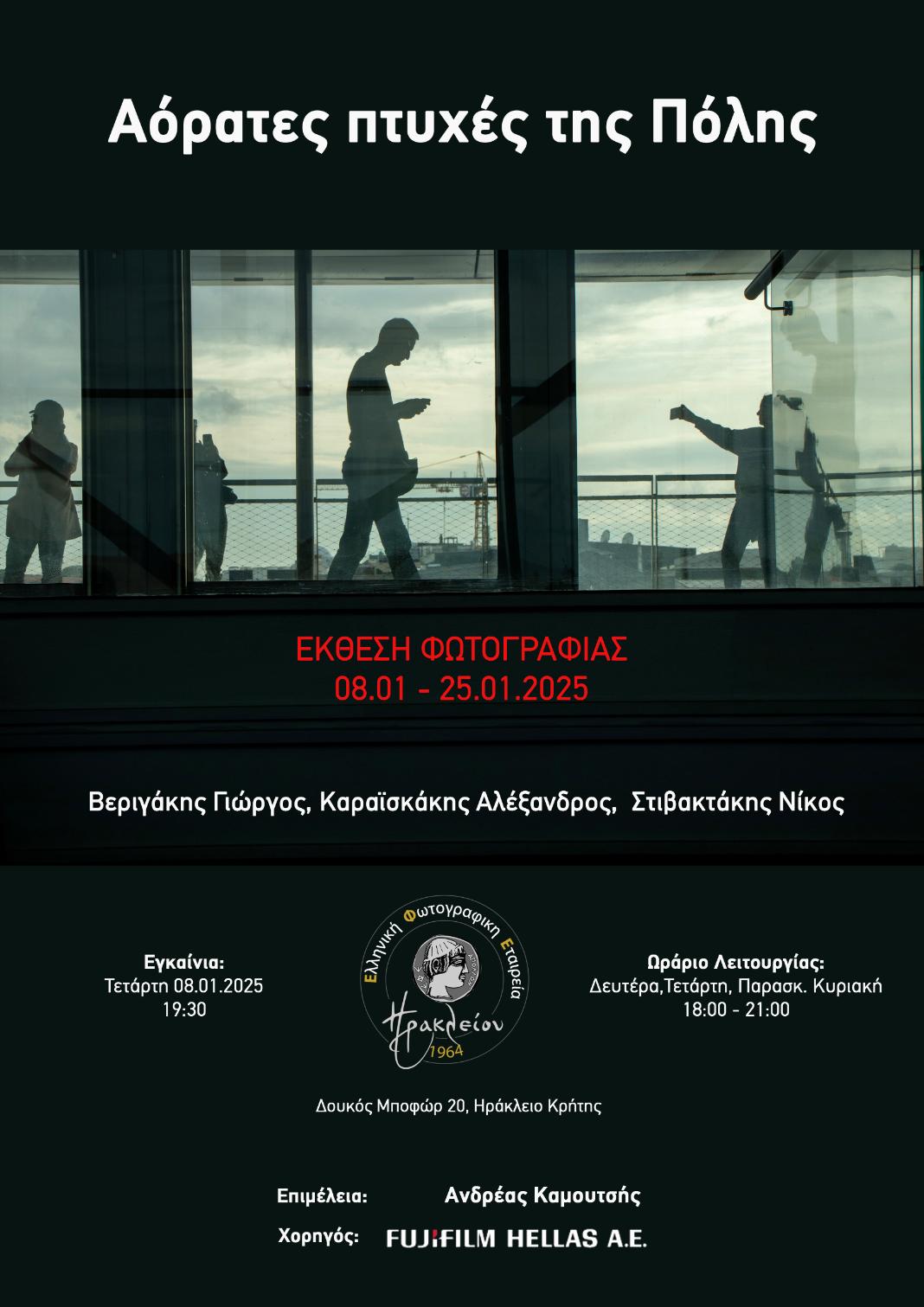 Οι φωτογράφοι «Βεριγάκης Γιώργος – Καραϊσκάκης Αλέξανδρος – Στιβακτάκης Νίκος» και η Ε.Φ.Ε. Ηρακλείου Κρήτης παρουσιάζουν την έκθεση φωτογραφίας με τίτλο «Aόρατες πτυχές της Πόλης», που προέκυψε από το οδοιπορικό στους δρόμους της Κωνσταντινούπολης τον Μάιο του 2024 στα πλαίσια σεμιναρίου φωτογραφίας δρόμου του Ανδρέα Καμουτσή.