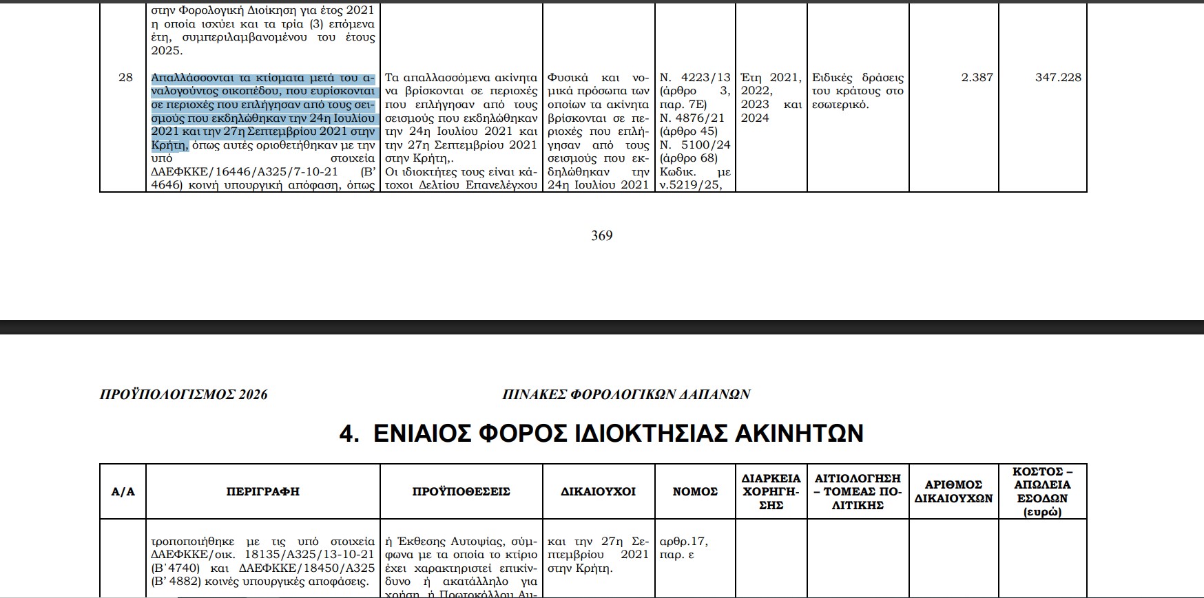 Η απαλλαγή του ΕΝΦΙΑ για τους πληγέντες από τον καταστροφικό σεισμό στο Αρκαλοχώρι, αναφέρεται στην έκθεση του προϋπολογισμού του 2026.