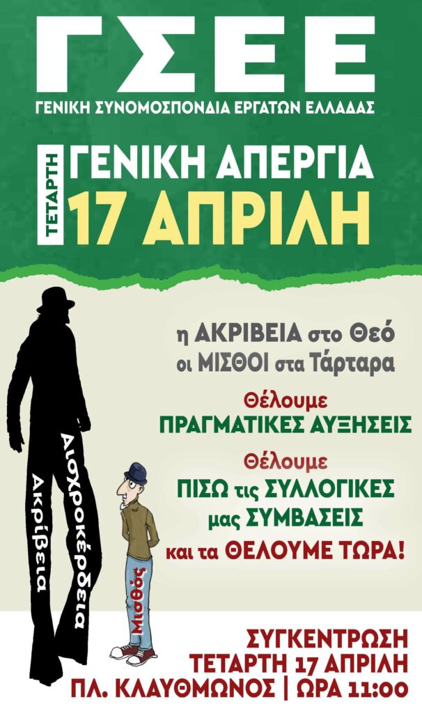 Σε «απεργιακό κλοιό» θα βρεθεί η χώρα την Τετάρτη 17 Απριλίου, λόγω της 24ωρης πανελλαδικής απεργίας που κήρυξε η ΓΣΕΕ, ζητώντας αυξήσεις στους μισθούς και επαναφορά των Συλλογικών Συμβάσεων Εργασίας, αλλά και αποτελεσματικά μέτρα για την αντιμετώπιση της ακρίβειας.