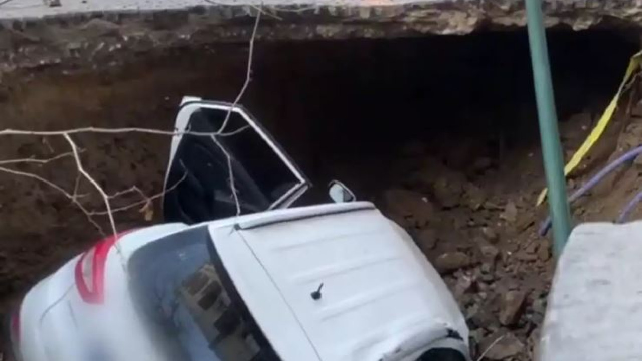Το άλλο όχημα ήταν σταθμευμένο ενώ κάτω από το έδαφος που υποχώρησε κατέληξε και ένα δέντρο.