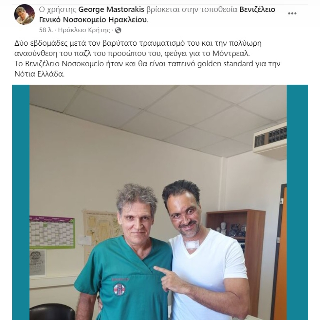 «Δύο εβδομάδες μετά τον βαρύτατο τραυματισμό του και την πολύωρη ανασύνθεση του παζλ του προσώπου του, φεύγει για το Μόντρεαλ. Το Βενιζέλειο Νοσοκομείο ήταν και θα είναι ταπεινό golden standard για την Νότια Ελλάδα», γράφει ο κ. Μαστοράκης στην ανάρτησή του.