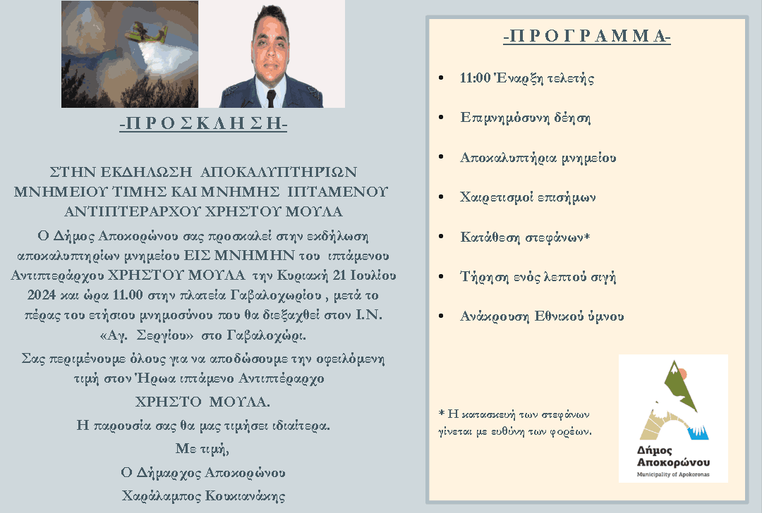 Εκδήλωση αποκαλυπτηρίων του μνημείου στη μνήμη του Ιπτάμενου Αντιπτεράρχου Χρήστου Μουλά θα πραγματοποιηθεί την Κυριακή 21 Ιουλίου 2024 και ώρα 11.00 στην πλατεία Γαβαλοχωρίου, μετά το πέρας του ετήσιου μνημοσύνου που θα διεξαχθεί στον Ι.Ν. «Αγ.Σεργίου» στο Γαβαλοχώρι.