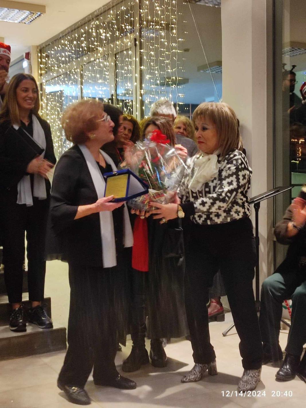 Με το πέρας του Μουσικού προγράμματος, σε κλίμα συγκίνησης, τιμήθηκε η κ. Ευμενούλα Σπινθάκη – Θαλασσινού για την πολυετή προσφορά της στο πολιτιστικό γίγνεσθαι του τόπου και του Μουσικού Συλλόγου «Απόλλων». Η τιμητική πλακέτα και το αναμνηστικό άλμπουμ δόθηκαν μετά από μικρή αναφορά που έγινε στην διαδρομή της κ. Ευμενούλας στα μονοπάτια της τέχνης, από την πρόεδρο Ιωάννα Γιάνναρη την αντιπρόεδρο Πέλα Κουγιουμτζάκη- Αλιφιεράκη την γραμματέα Μαίρη Μαρκοπούλου και τον μαέστρο του χορωδιακού συνόλου του «Απόλλων» Μάνο Παναγιωτάκη.