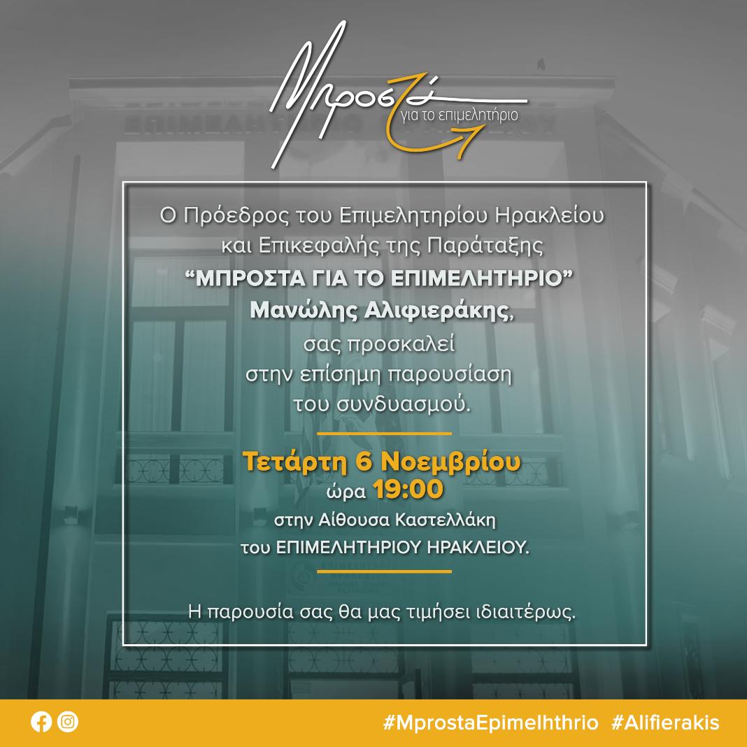 Σήμερα 6 Νοεμβρίου θα πραγματοποιηθεί η επίσημη παρουσίαση του συνδυασμού «ΜΠΡΟΣΤΑ ΓΙΑ ΤΟ ΕΠΙΜΕΛΗΤΗΡΙΟ», με επικεφαλής τον υποψήφιο Μανώλη Αλιφιεράκη.