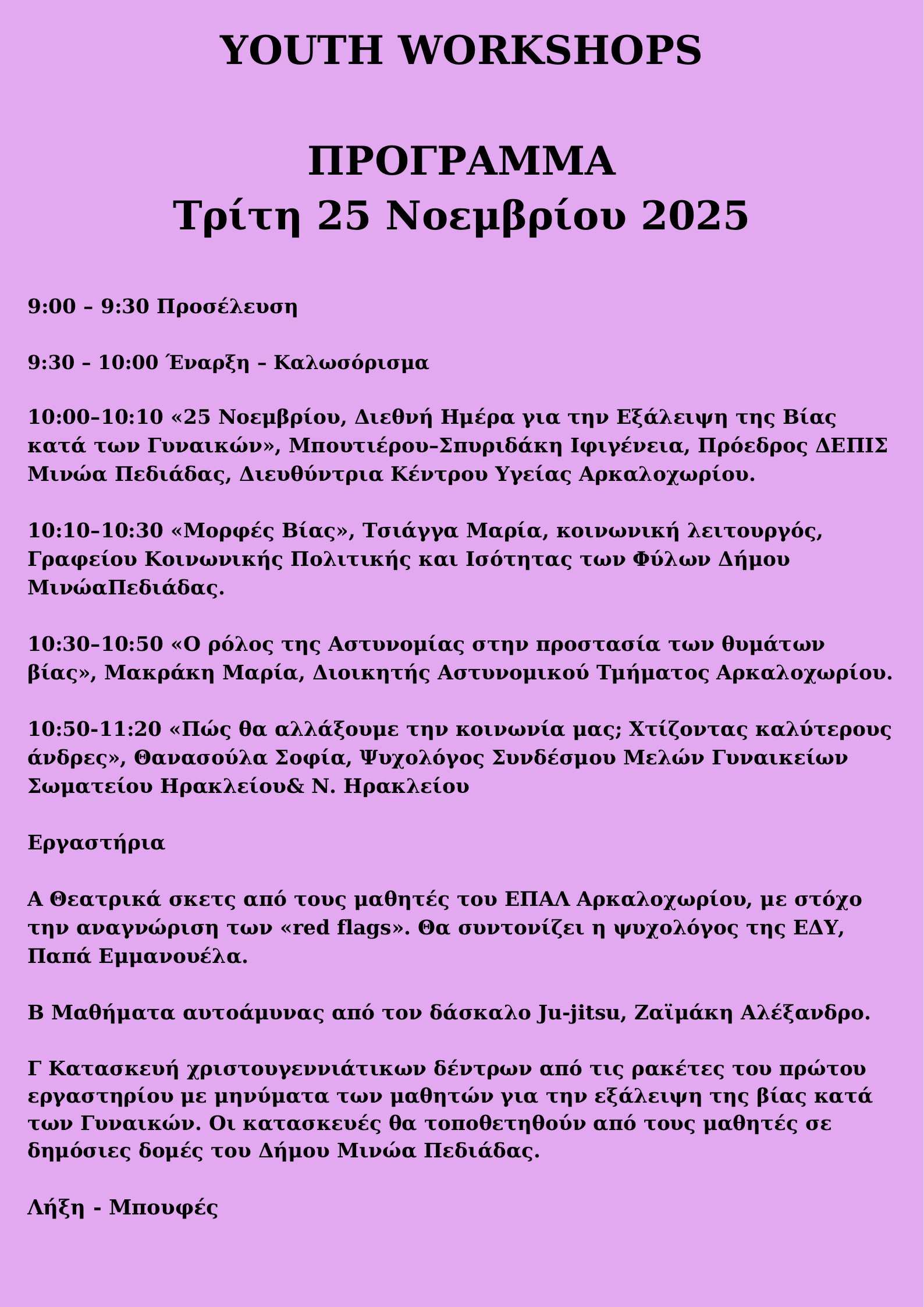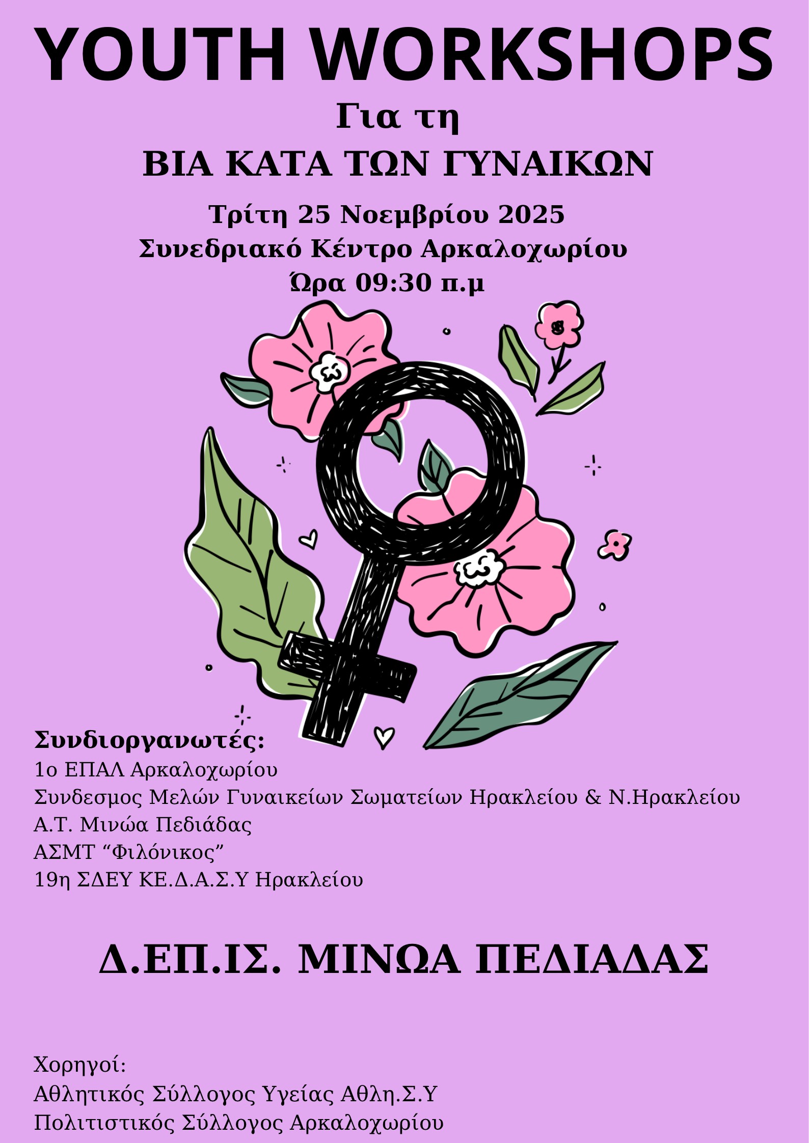 Με αφορμή τη Διεθνή Ημέρα για την Εξάλειψη της Βίας κατά των Γυναικών, η Δημοτική Επιτροπή Ισότητας (ΔΕΠΙΣ) Δήμου Μινώα Πεδιάδας, διοργανώνει ενημερωτική και βιωματική δράση με τίτλο “Youth Workshops”, την Τρίτη 25 Νοεμβρίου 2025, στο Συνεδριακό Κέντρο Αρκαλοχωρίου, στις 9:30 π.μ.