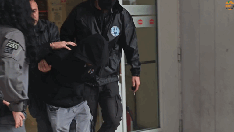 Ο 40χρονος οδηγήθηκε στην Εισαγγελία Πειραιά στις 8 το πρωί και λίγο μετά τις δύο το μεσημέρι εξήλθε με σκυμμένο κεφάλι και φορώντας κουκούλα.