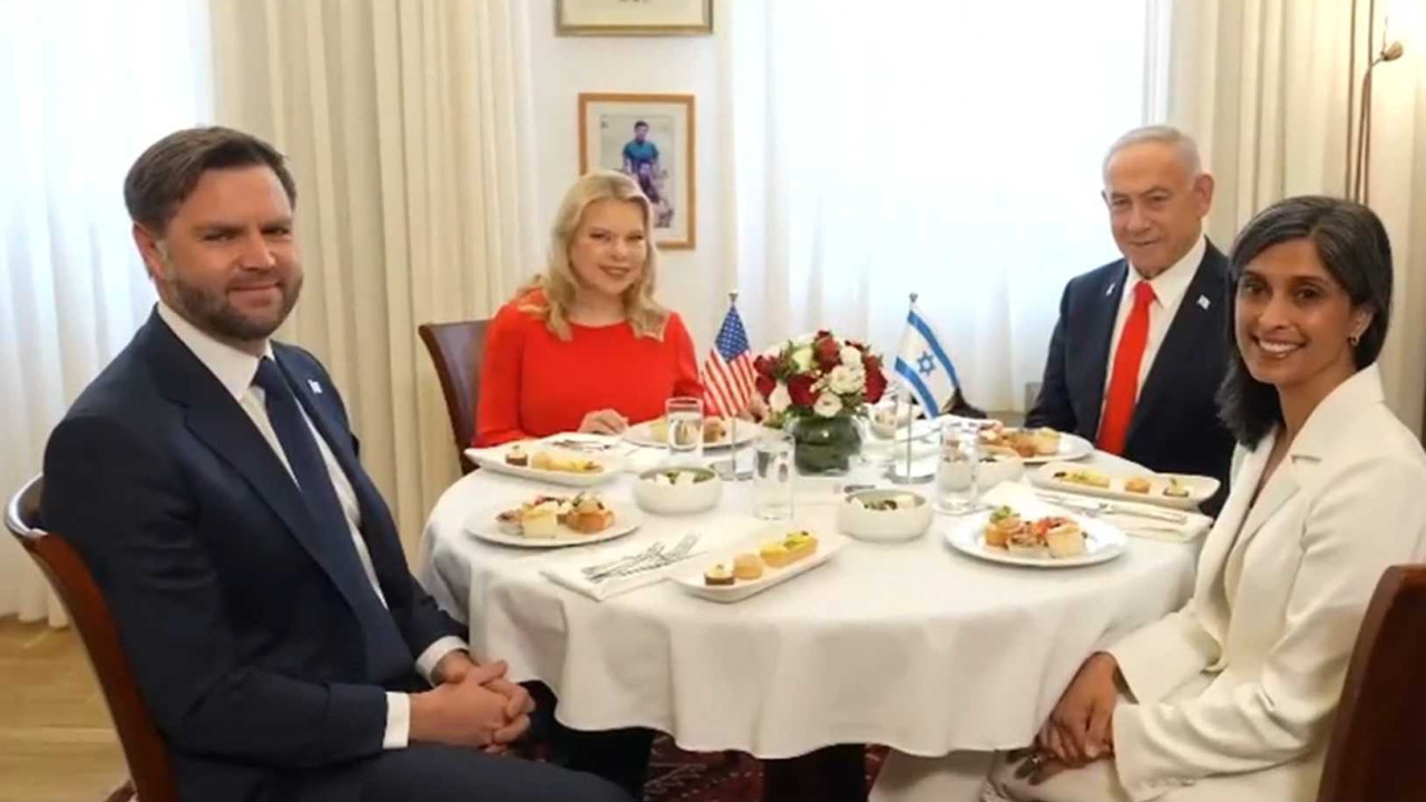 Το γραφείο του Νετανιάχου έδωσε στη δημοσιότητα βίντεο, στο οποίο ο ίδιος και η σύζυγός του Σάρα χαιρετούν τον αντιπρόεδρο των ΗΠΑ και τη σύζυγό του Ούσα Βανς, που τον συνοδεύει στο ταξίδι του, στο γραφείο του στην Ιερουσαλήμ.