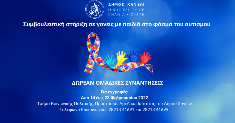 ΠερισσότεραΤο Τμήμα Κοινωνικής Πολιτικής, Προστασίας ΑΜΕΑ και Ισότητας του Δήμου Χανίων, ανακοινώνει τη δημιουργία ομάδας, για δωρεάν συναντήσεις συμβουλευτικής στήριξης...