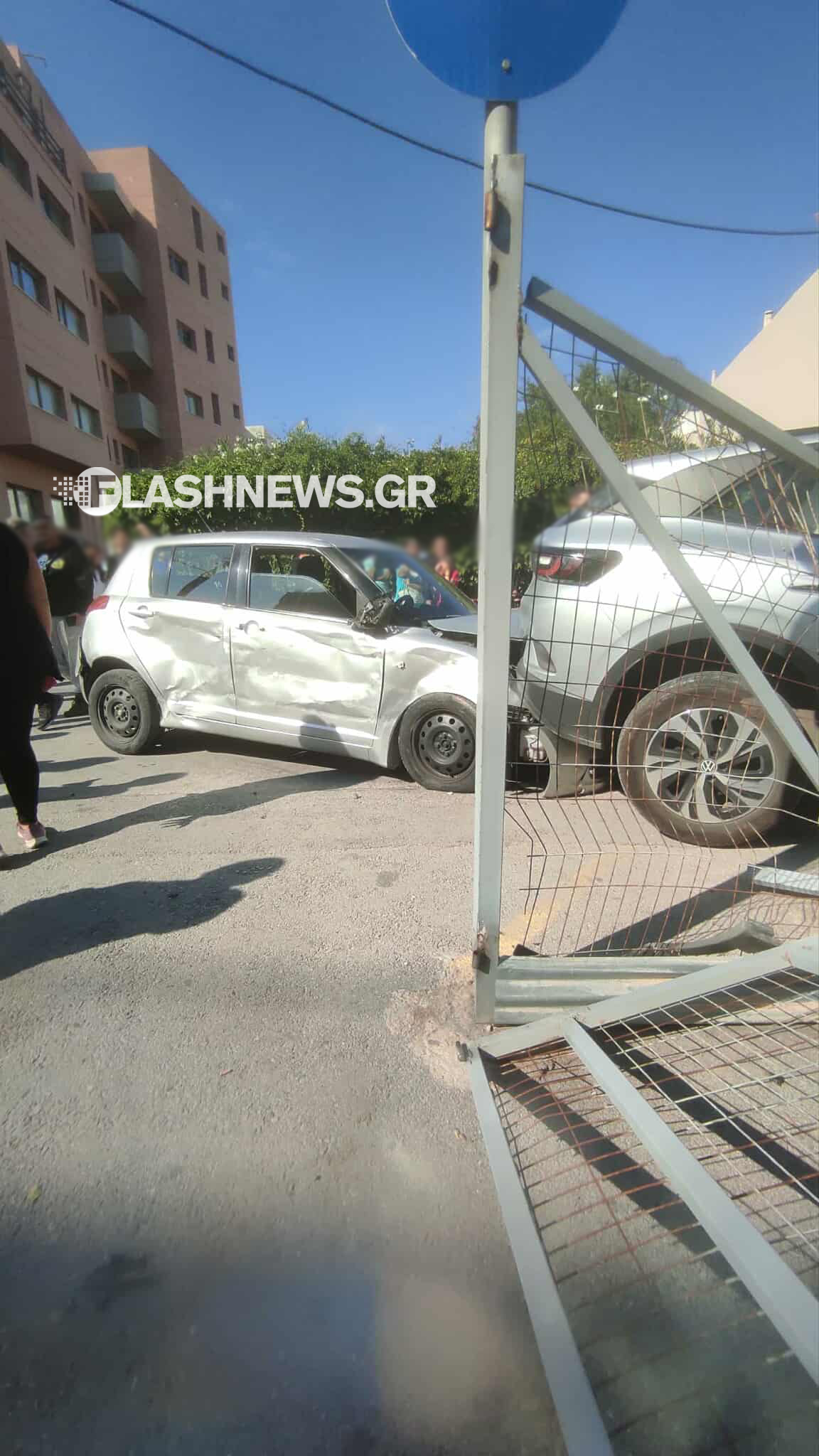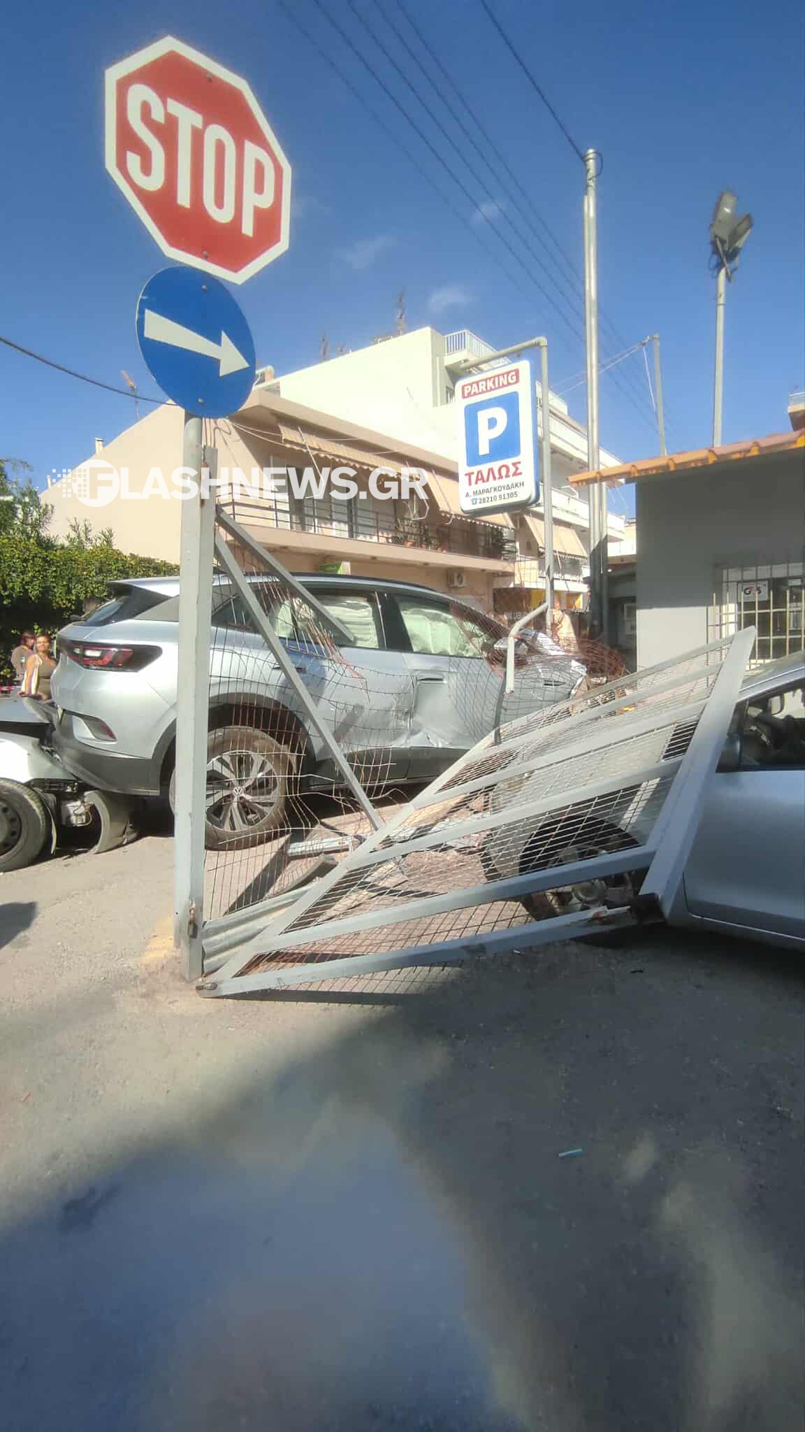 Μάλιστα, σύμφωνα με αυτόπτη μάρτυρα, το όχημα σχεδόν «πετάχτηκε» στον αέρα, ενώ στη συνέχεια φαίνεται να «προσγειώθηκε» πάνω στα άλλα οχήματα αλλά και στην είσοδο του υπαίθριου πάρκινγκ που βρίσκεται στο σημείο, ρίχνοντας κάτω την καγκελόπορτα.