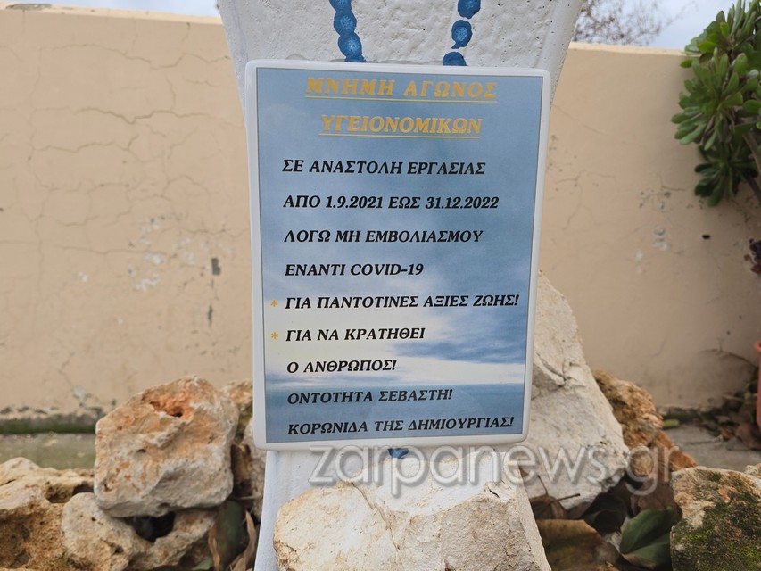Όπως βλέπετε στις φωτογραφίες του zarpanews.gr, στην σχετική ταμπέλα που το συνοδεύει, αναγράφεται: «Μνήμη αγώνος υγειονομικών. Από 1.9.2021 έως 31.12.2022 λόγω μη εμβολιασμού έναντι covid -19. Για παντοτινές αξίες ζωής. Για να κρατηθεί ο άνθρωπος! Οντότητα σεβαστή! Κορωνίδα της δημιουργίας!».