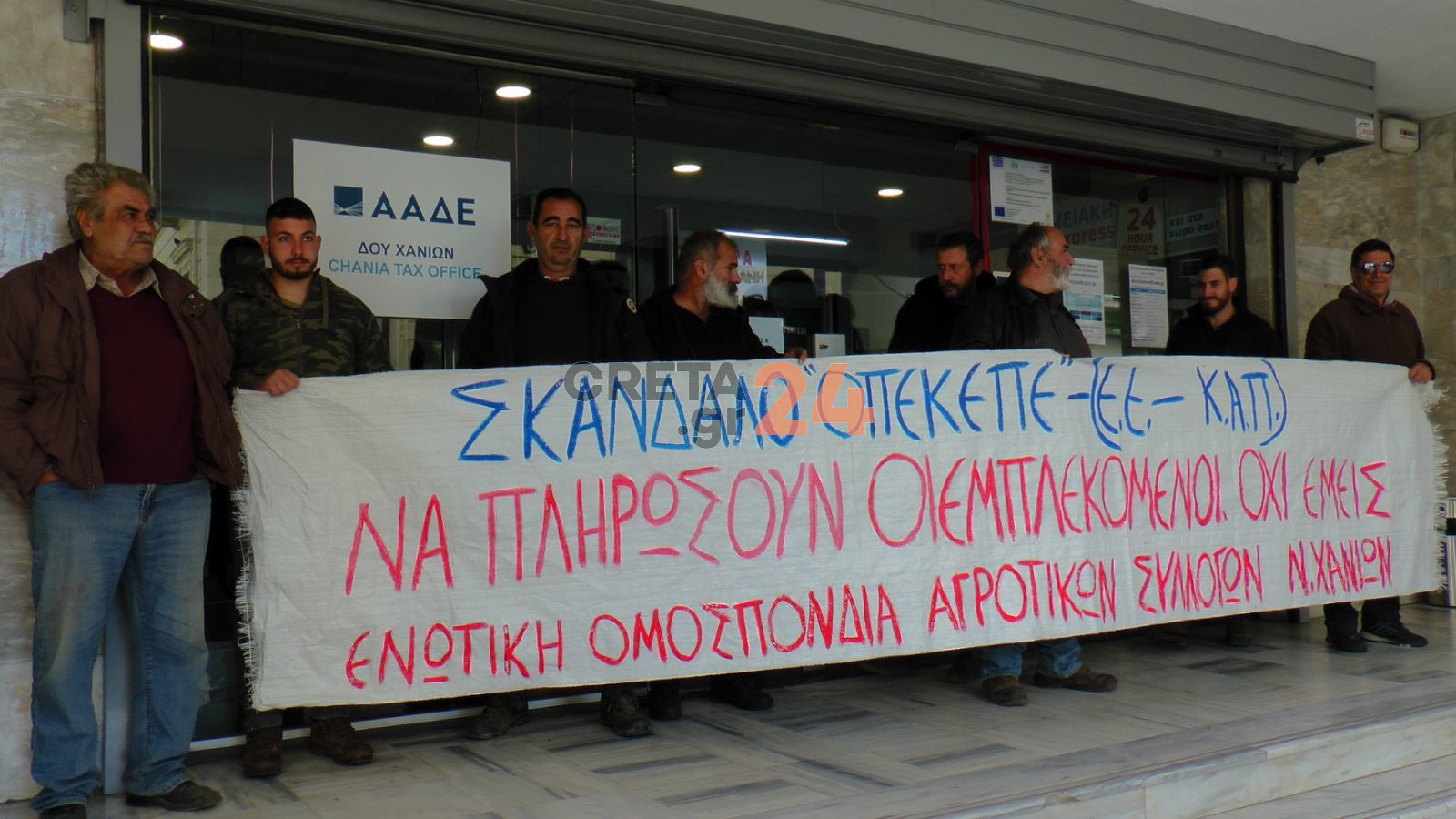 Νωρίτερα σήμερα το πρωί (9/1), σε διαμαρτυρία έξω από τα γραφεία της Ανεξάρτητης Αρχής Δημοσίων Εσόδων στα Χανιά προχώρησαν οι αγρότες, μαζί με μέλη πρωτοβάθμιων σωματείων της πόλης.