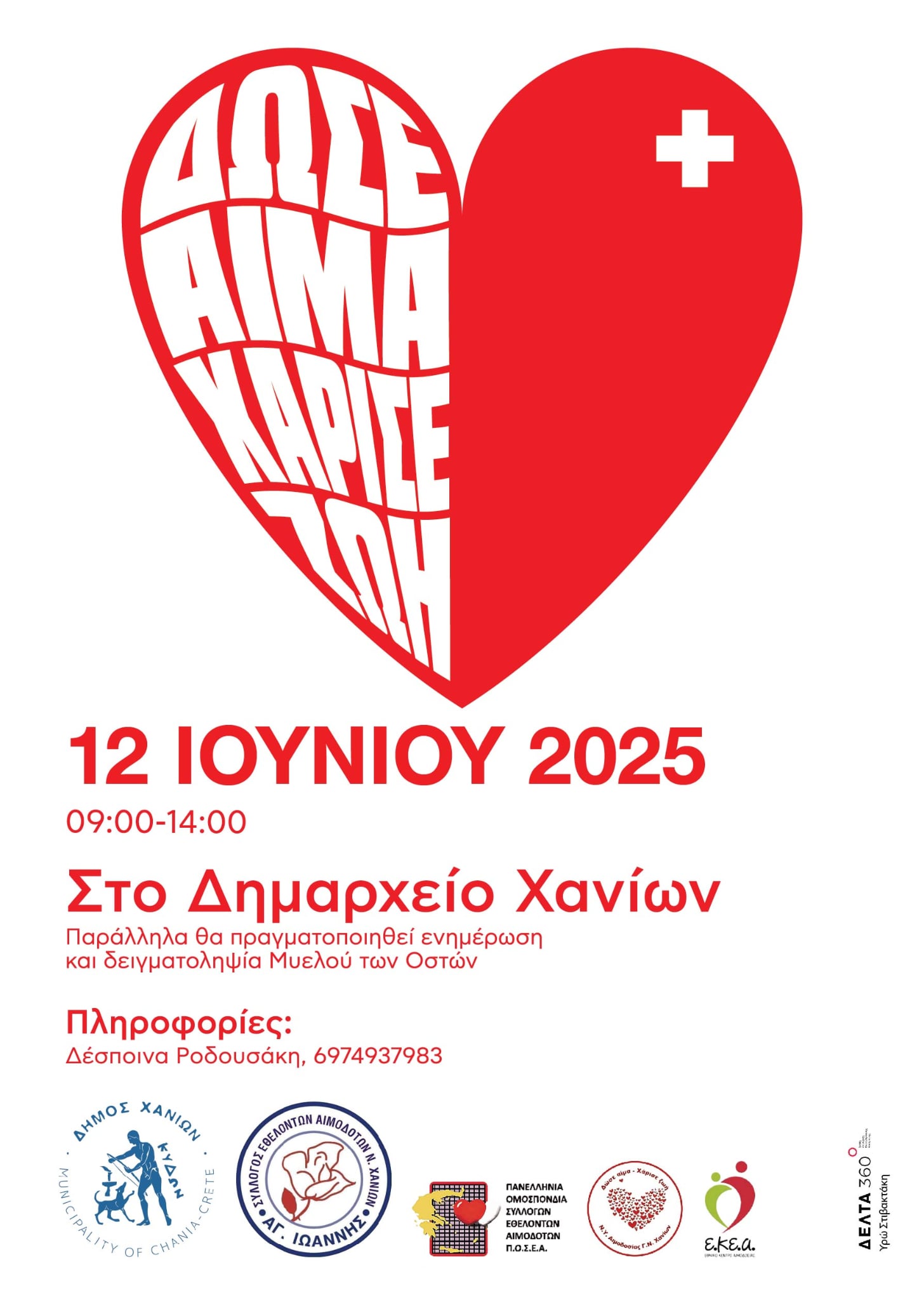 Με αφορμή την Παγκόσμια Ημέρα Εθελοντή Αιμοδότη, που έχει καθιερωθεί να εορτάζεται στις 14 Ιουνίου διεθνώς, διοργανώνεται εθελοντική αιμοδοσία την Πέμπτη 12/06/2025, από τις 9.00 έως τις 14.00, στο Δημαρχείο Χανίων.