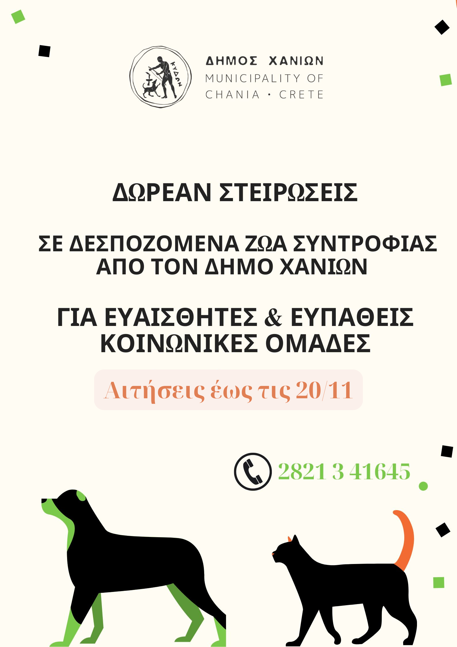 Ο Δήμος Χανίων ενεργοποιεί για τέταρτη φορά για το έτος 2025 το πρόγραμμα δωρεάν στείρωσης δεσποζόμενων ζώων συντροφιάς πολιτών, οι οποίοι διαμένουν εντός των διοικητικών ορίων του Δήμου και ανήκουν στις παρακάτω ευαίσθητες και ευπαθείς κοινωνικές ομάδες: