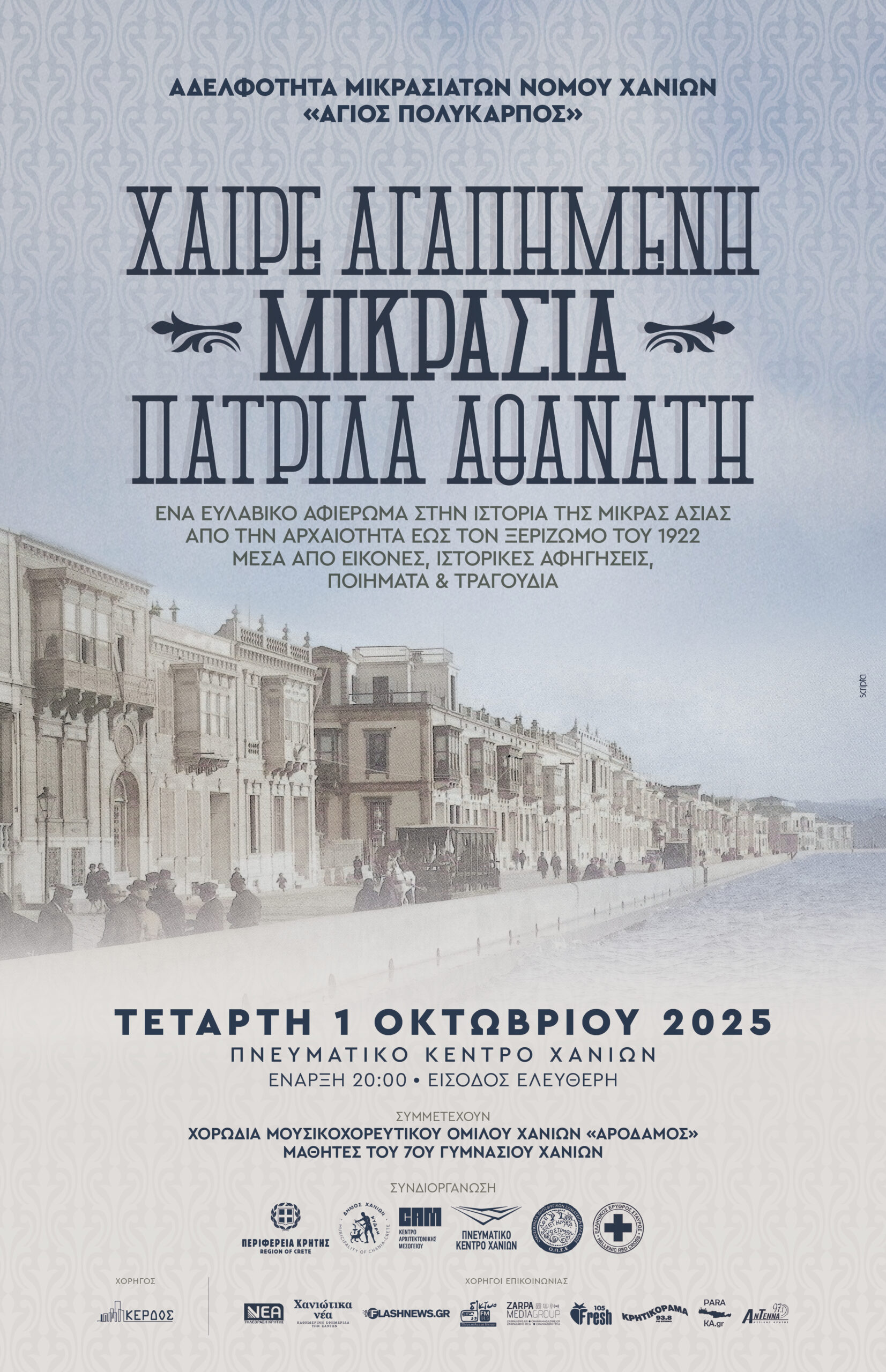 Η Αδελφότητα Μικρασιατών Ν. Χανίων «Ο Άγιος Πολύκαρπος», σε συνδιοργάνωση με την Περιφέρεια Κρήτης – Περιφερειακή Ενότητα Χανίων, το Δήμο Χανίων, το ΚΑΜ και τον Ελληνικό Ερυθρό Σταυρό, διοργανώνει επετειακή εκδήλωση με τίτλο: «Χαίρε Αγαπημένη Μικρασία, Πατρίδα Αθάνατη», την Τετάρτη 1 Οκτωβρίου 2025, ώρα 08.00 μ.μ., στο Πνευματικό Κέντρο Χανίων.