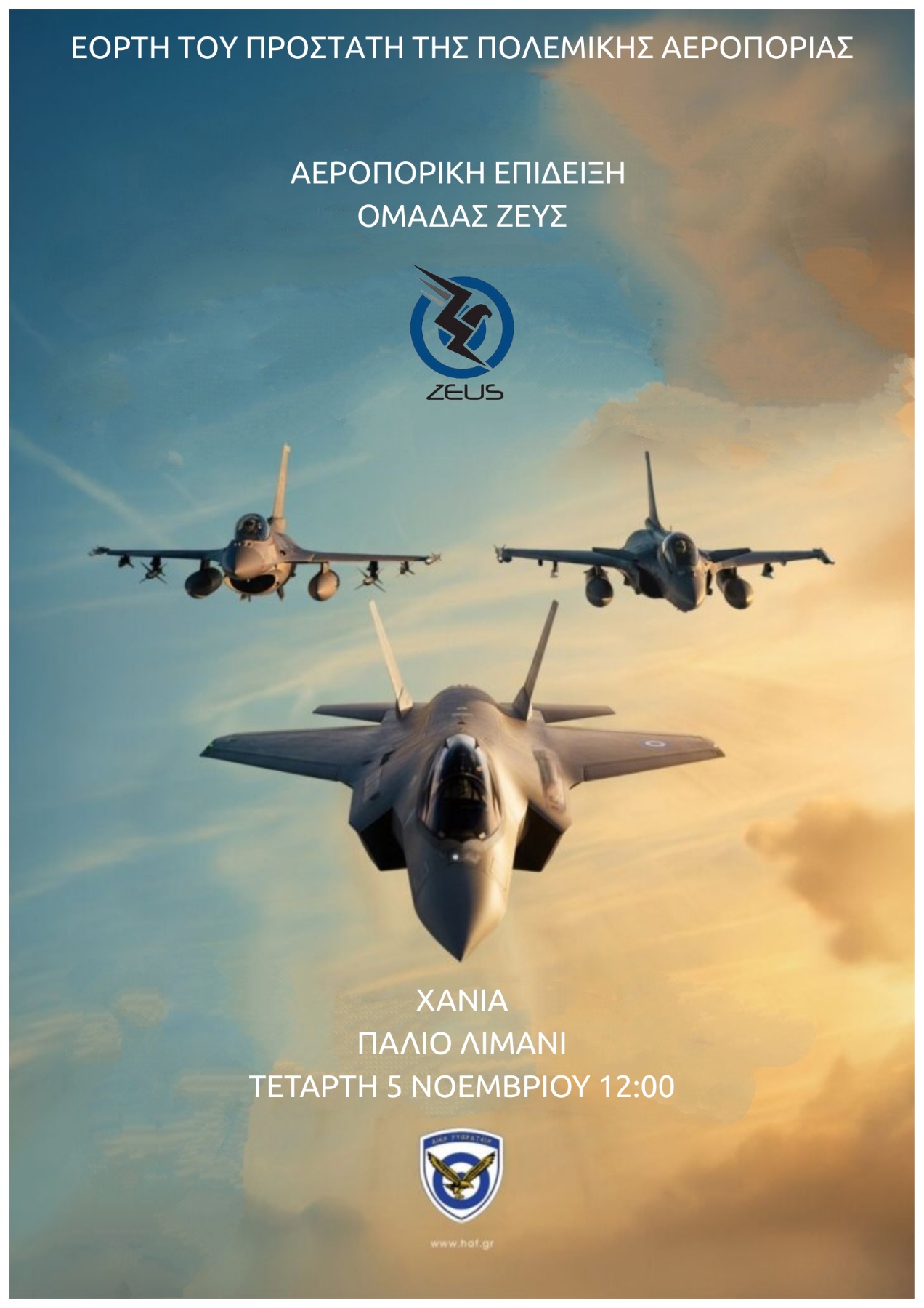 Aαύριο Τετάρτη 5 Νοεμβρίου 2025, κατά τη διάρκεια του εορτασμού του Προστάτη της Πολεμικής Αεροπορίας (ΠΑ), Αρχαγγέλου Μιχαήλ, θα πραγματοποιηθεί αεροπορική επίδειξη της Ομάδας Αεροπορικών Επιδείξεων μεμονωμένου αεροσκάφους F16 «ZEYS», στο Ενετικό Λιμάνι των Χανίων.