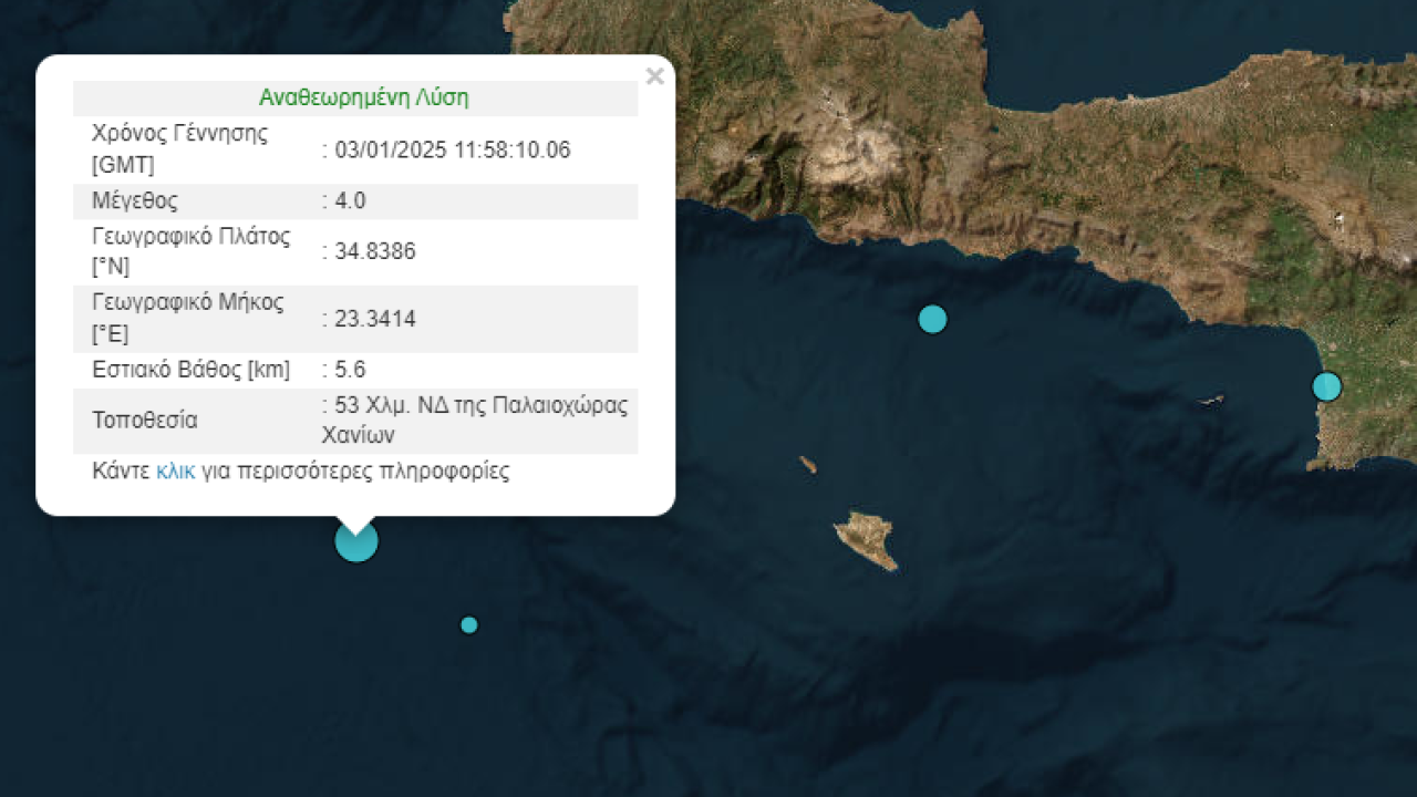 Το επίκεντρο της δόνησης εντοπίζεται στον θαλάσσιο χώρο 52 χλμ. νοτιοδυτικά της Παλαιοχώρας Χανίων.