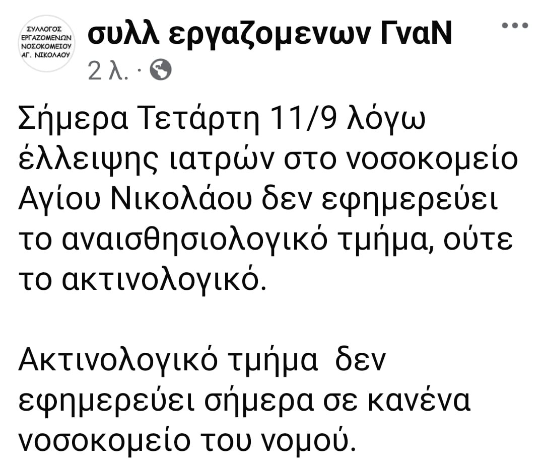 Όπως αναφέρεται στην ανακοίνωση του Συλλόγου Εργαζομένων του Νοσοκομείου Αγίου Νικολάου: «Σήμερα Τετάρτη 11/9 λόγω έλλειψης ιατρών στο νοσοκομείο Αγίου Νικολάου δεν εφημερεύει το αναισθησιολογικό τμήμα, ούτε το ακτινολογικό. Ακτινολογικό τμήμα δεν εφημερεύει σήμερα σε κανένα νοσοκομείο του νομού».