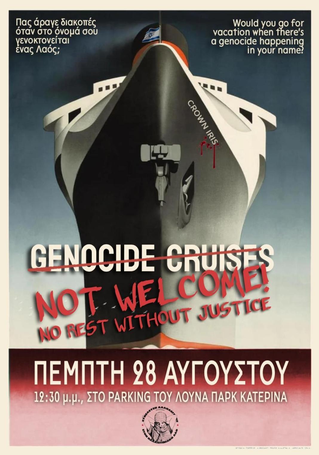 Μετά τον Άγιο Νικόλαο, το ισραηλινό κρουαζιερόπλοιο Crown Iris θα φτάσει αύριο Πέμπτη 28 Αυγούστου και στο λιμάνι του Ηρακλείου, με την «Συνέλευση Αλληλεγγύης στον Παλαιστινιακό Λαό», να καλεί φορείς, πολίτες και σωματεία να δώσουν δυναμικό παρών στη συγκέντρωση διαμαρτυρίας που προγραμματίζουν στον χώρο στάθμευσης του Λούνα Παρκ «Κατερίνα».
