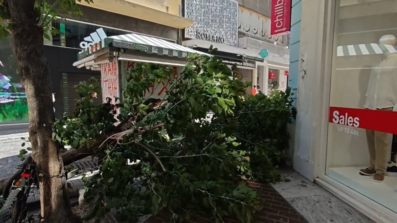 Από τύχη δεν καταγράφηκε τραυματισμός όταν στις 9:30 στον κεντρικότερο δρόμο της πρωτεύουσας, την Ερμού έπεσε δέντρο λόγω των ισχυρών ανέμων.