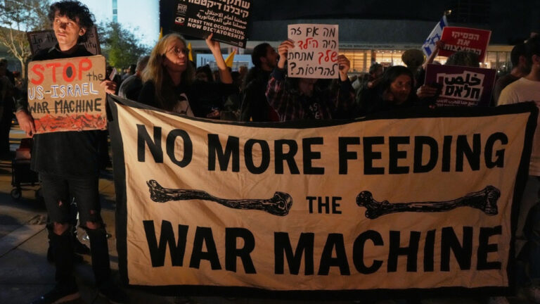 Σε συγκέντρωση στο Τελ Αβίβ του Ισραήλ χθες το βράδυ, άνθρωποι ανέμιζαν ισραηλινές σημαίες και κρατούσαν πλακάτ που ζητούσαν τον τερματισμό του πολέμου. «Οι ξένες βόμβες δεν απελευθερώνουν κανέναν», έγραφε ένα πλακάτ, ενώ ένα άλλο ανέφερε «όχι άλλο τάισμα της πολεμικής μηχανής».