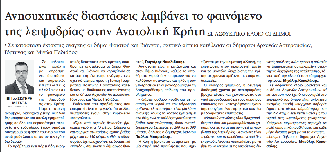 “Απαιτούνται λύσεις τόσο βραχυπρόθεσμου όσο και μακροπρόθεσμου χαρακτήρα για να αντιμετωπιστεί το πρόβλημα της λειψυδρίας. Οι ανάγκες είναι τεράστιες και τα αποθέματα νερού δεν επαρκούν. Γίνονται προσπάθειες για να βγει το καλοκαίρι με τις μικρότερες δυνατές απώλειες αλλά πρέπει η πολιτεία να διαμορφώσει συγκεκριμένη στρατηγική διαχείρισης της κατάστασης“, τόνισε από την πλευρά του ο δήμαρχος Γόρτυνας Μιχάλης Κοκολάκης.