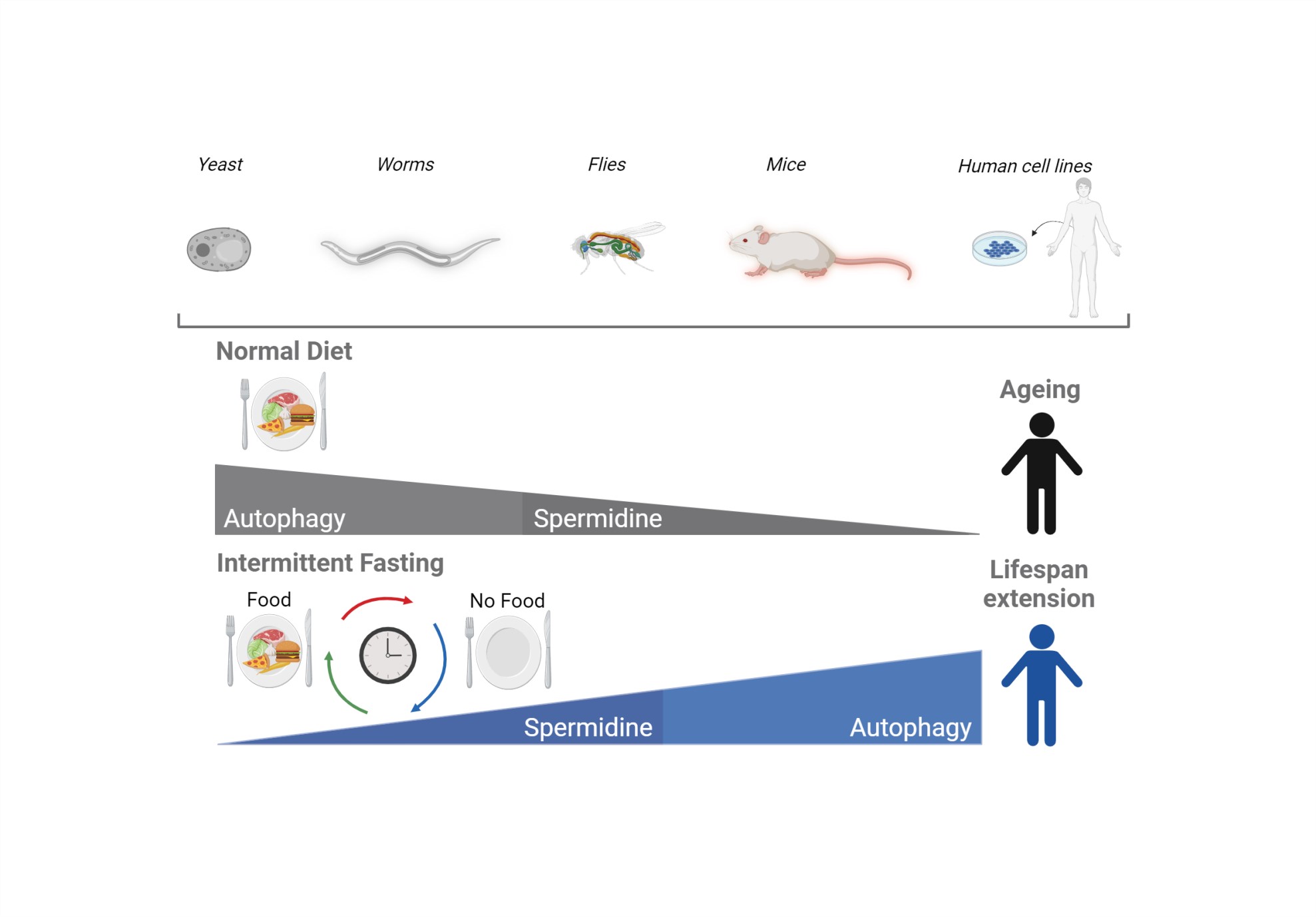 Χρησιμοποιώντας μια σειρά πειραματικών οργανισμών, όπως ο νηματώδης (Caenorhabditis elegans), η ζύμη (Saccharomyces cerevisiae), η μύγα των φρούτων (Drosophila melanogaster), το ποντίκι (Mus musculus) και οι ανθρώπινες κυτταρικές σειρές, οι ερευνητικές ομάδες των καθηγητών Νεκτάριου Ταβερναράκη, Guido Kroemer και Frank Madeo, έδειξαν ότι η διαλειμματική νηστεία αυξάνει τα κυτταρικά επίπεδα σπερμιδίνης, η οποία με τη σειρά της αυξάνει την αυτοφαγία με αποτέλεσμα την αύξηση της διάρκειας ζωής των οργανισμών αυτών. Αντίθετα, η αναστολή της σύνθεσης της σπερμιδίνης με τη χρήση κατάλληλων αναστολέων εξουδετερώνει τα οφέλη της αυτοφαγίας στην παράταση της διάρκειας ζωής μέσω της διαλειμματικής νηστείας.