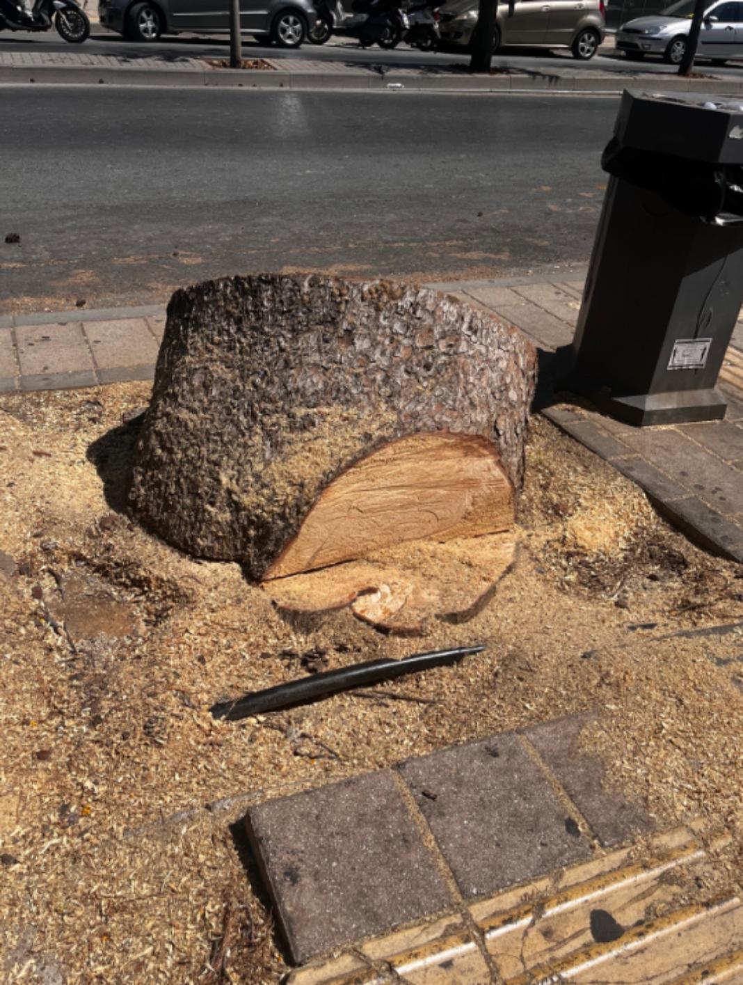 Επειδή είμασταν παρόντες κατά την υλοτόμησή του, ενσωματώνουμε στο παρόν ΔΤ πέντε από φωτογραφίες που λήφθησαν τόσο κατά την διάρκεια της κοπής όσο και από το πρεμνό του δέντρου που παρέμεινε στο έδαφος οι οποίες καταδεικνύουν ότι το δέντρο δεν είχε κανένα απολύτως πρόβλημα σε κανένα σημείο του. Οι φωτογραφίες, αλλά και δείγμα που ελήφθη από το σημείο θα σταλούν για πραγματογνωμοσύνη. Επισυνάπτουμε και μία φωτογραφία από την διπλανή δενδροδόχο του κομμένου πεύκου, μπροστά επίσης από το Εργατικό Κέντρο προκειμένου να γίνει κατανοητό στους πολίτες, που δεν μπορούν να πιστέψουν ότι ο Δήμος παρανομεί τόσο αναίσχυντα, τι εννοούν όταν λένε ότι θα φυτέψουν «νέο δέντρο»: Ένα κλαράκι διαμέτρου δυο πόντων το οποίο είναι ήδη ξερό.